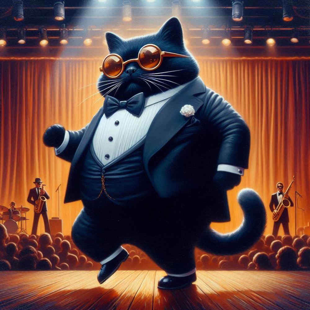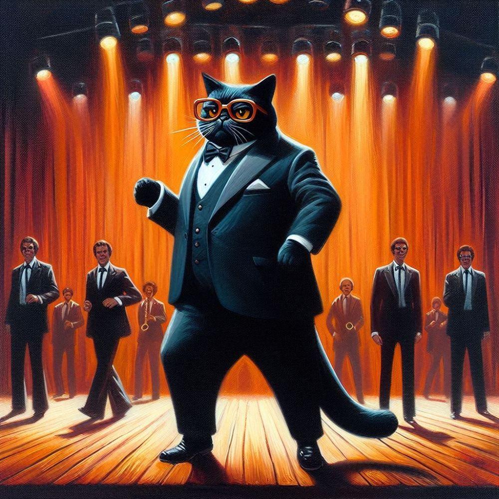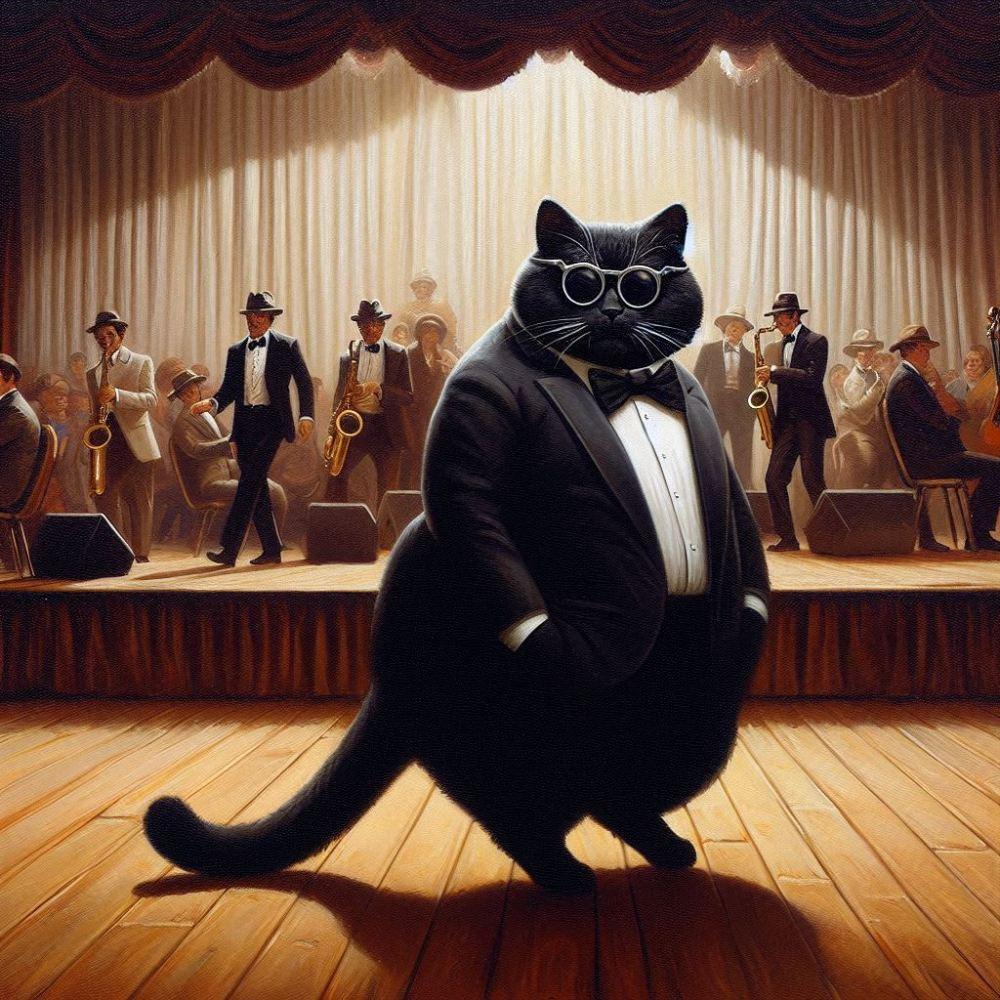 油絵ファンタジー、眼鏡で踊る黒猫ステージ