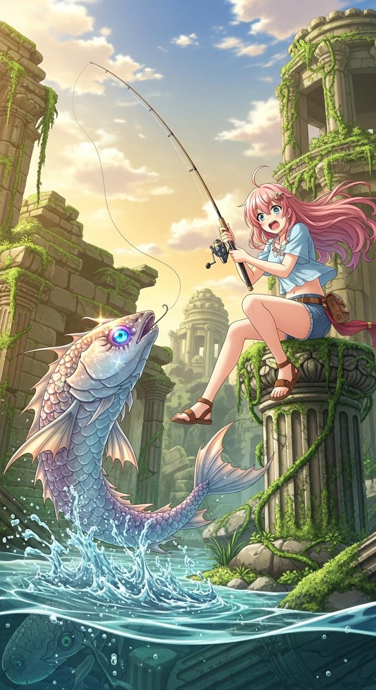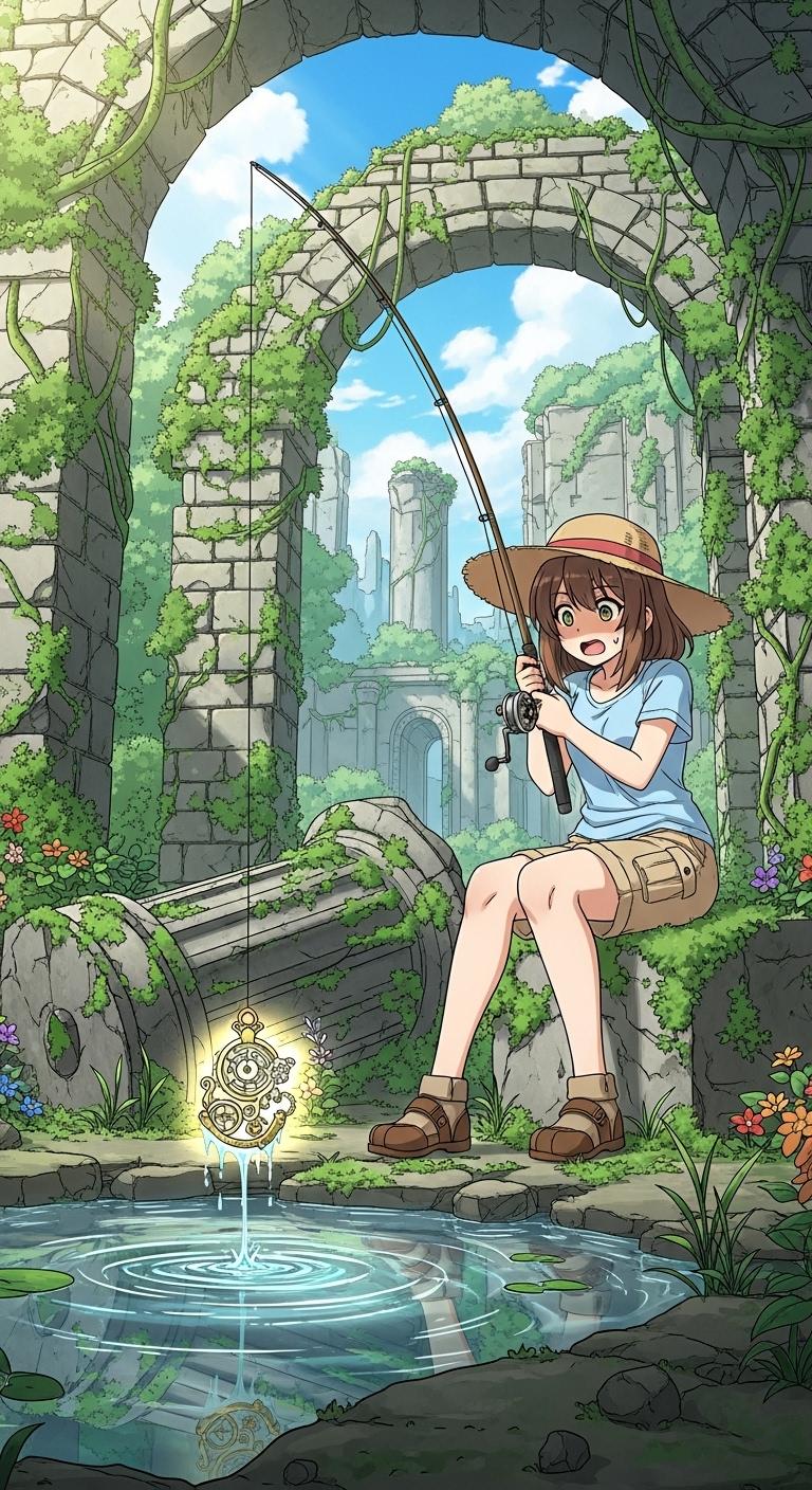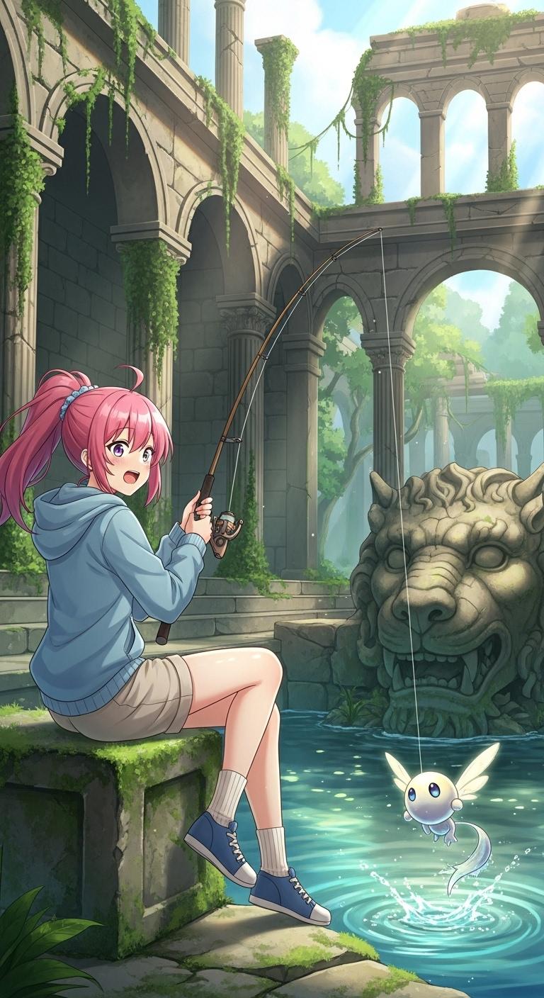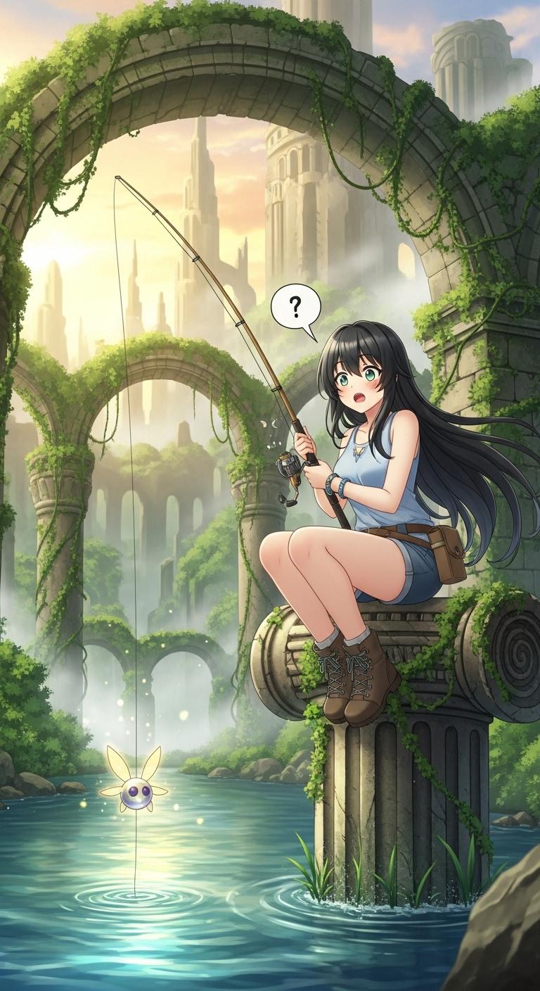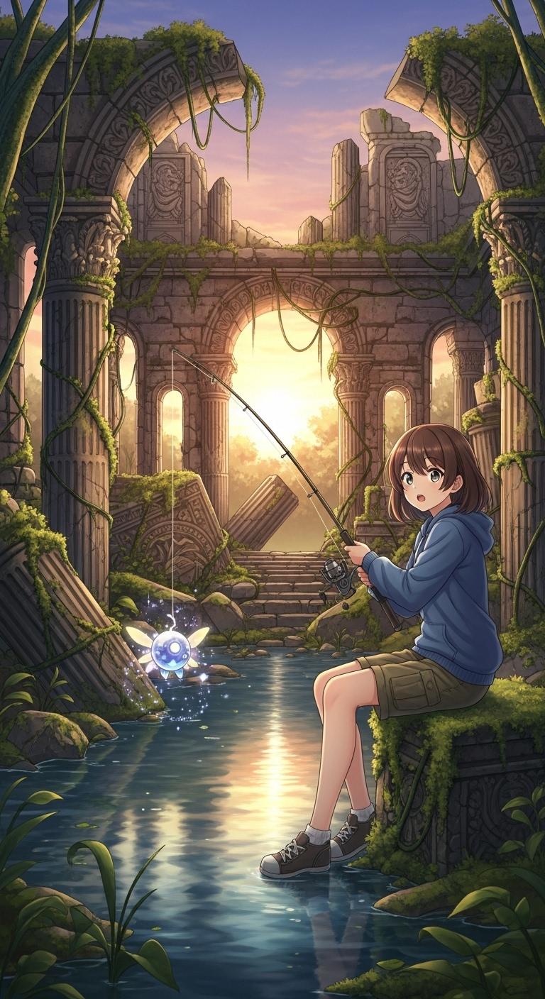 古代遺跡で釣りをする