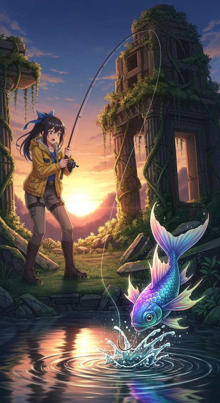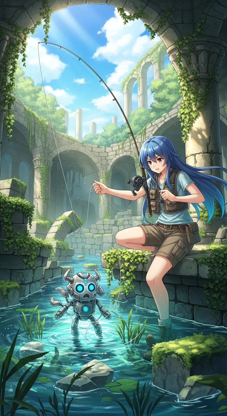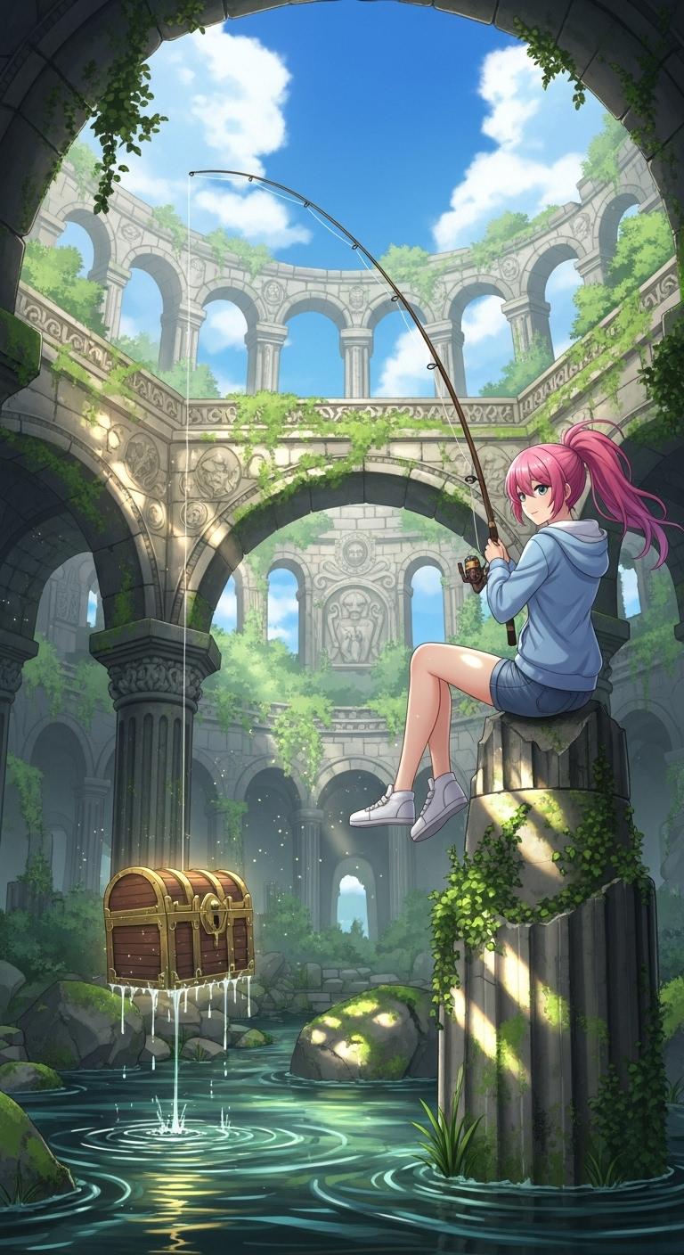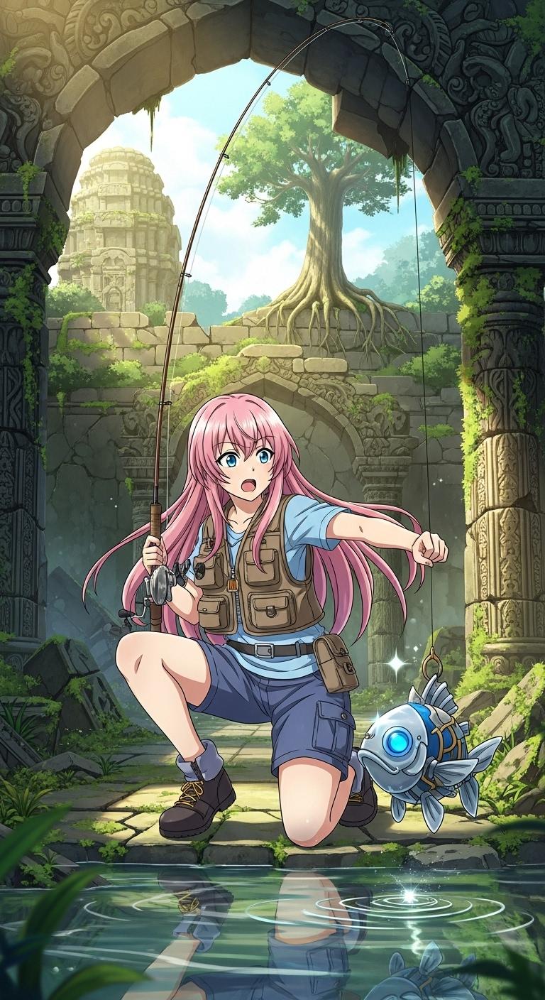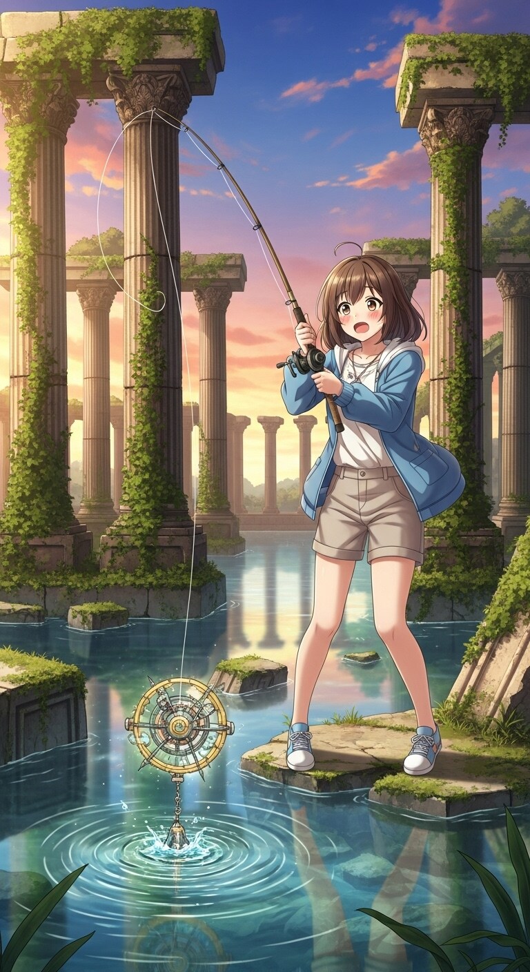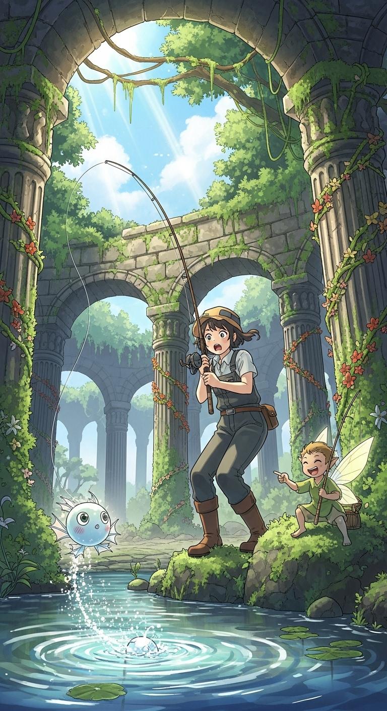 古代遺跡で釣りをする