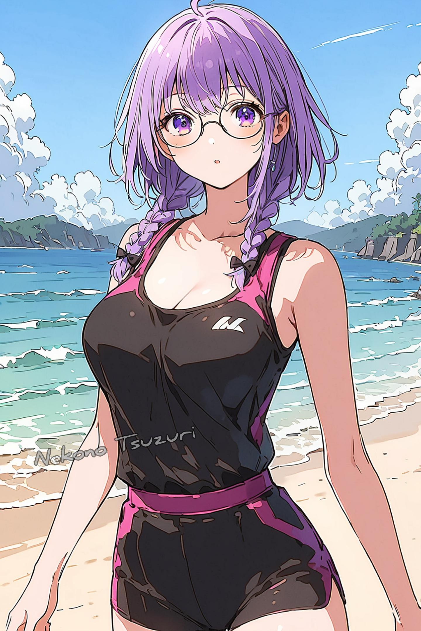 1girl,27yo,丸眼鏡,short hair,purple hair,三つ編み,purple eyes,middle breast,