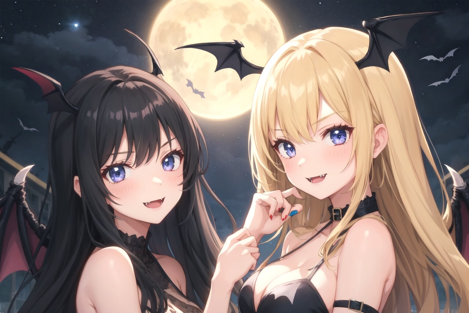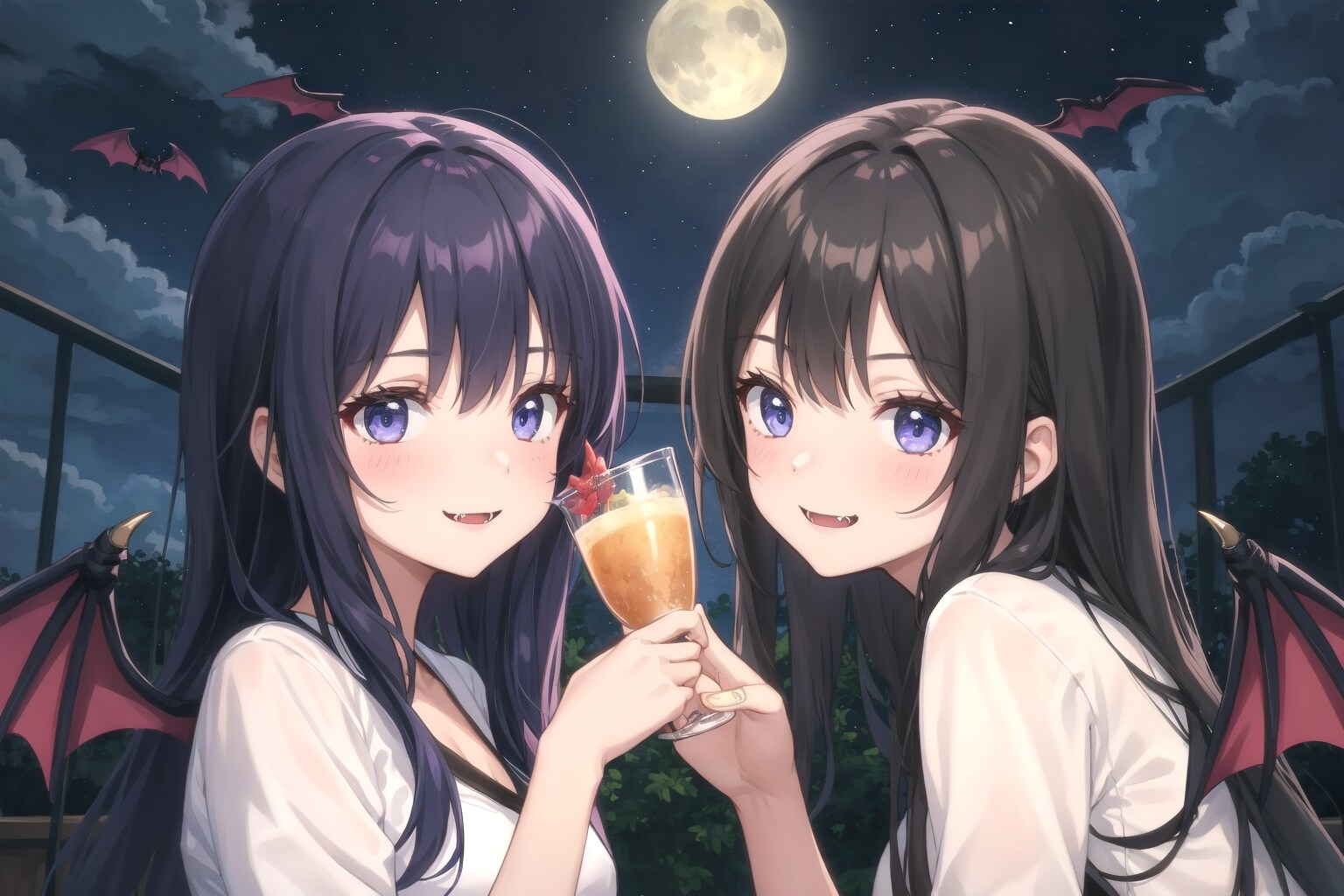コウモリが深夜の空を飛んでいる中、牙とコウモリの羽を生やした女の子が、遊んでる光景がそのまんま出来ましたね。
