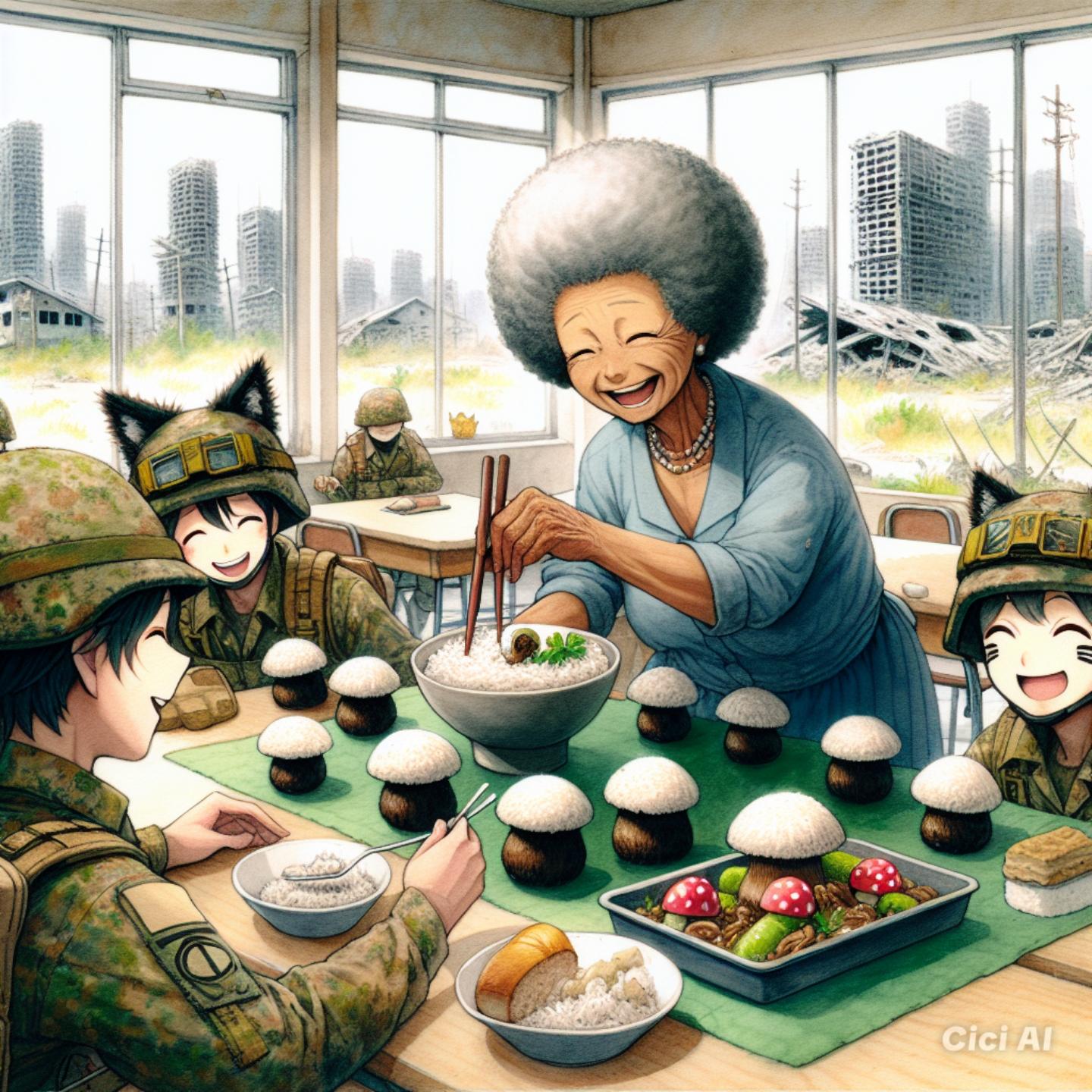 キノ戦 いっぱいお食べ~、笑顔で料理を振る舞う アフロボン婆