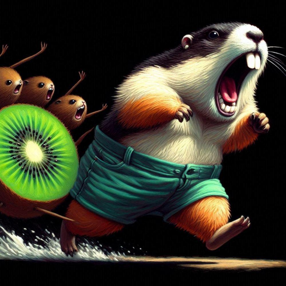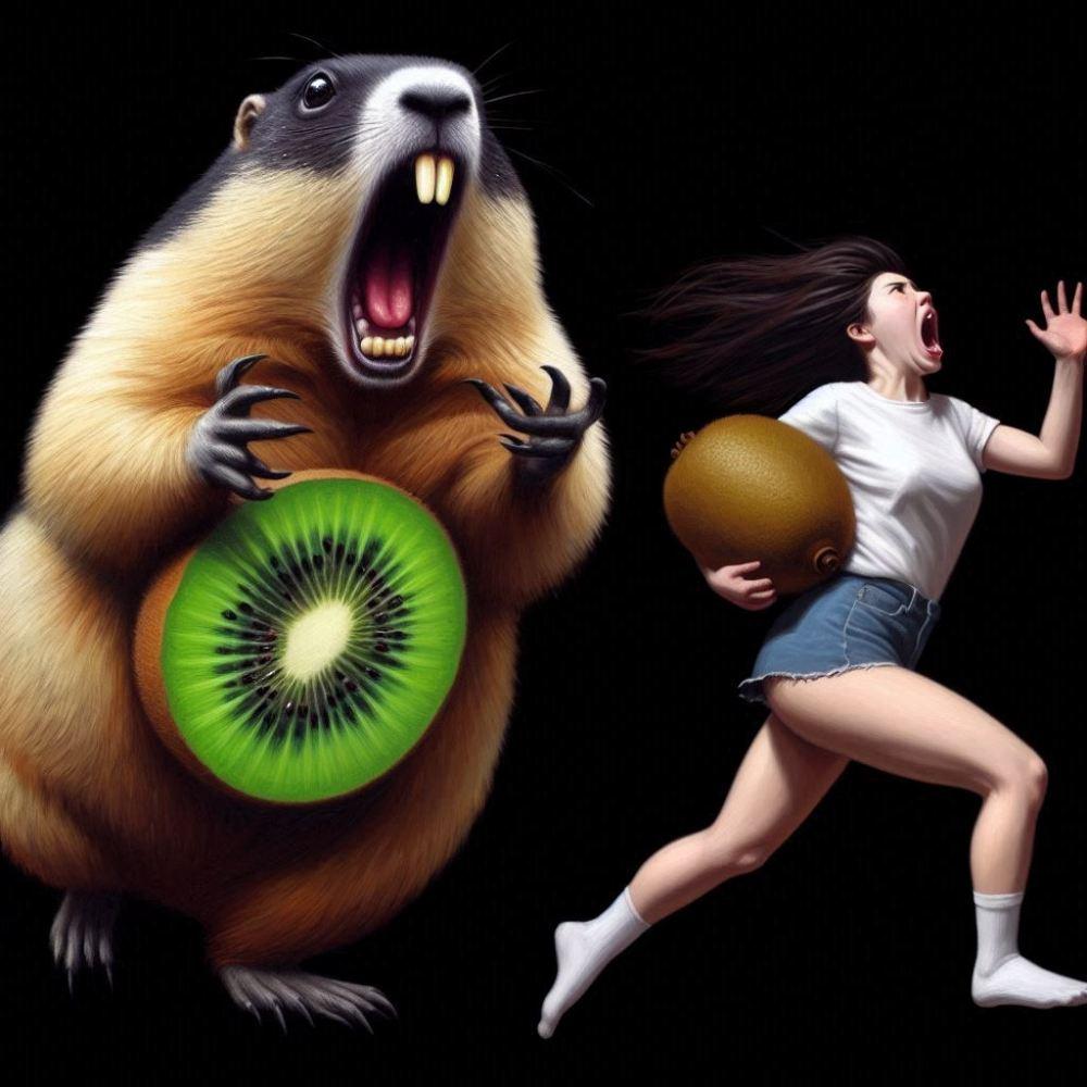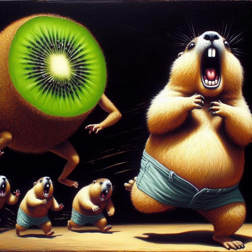 油絵風、キウイフルーツに追いかけられて走って逃げるショートパンツマーモット