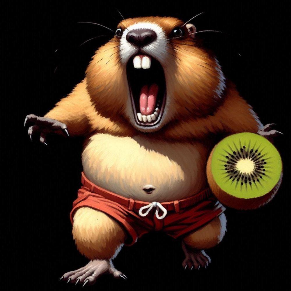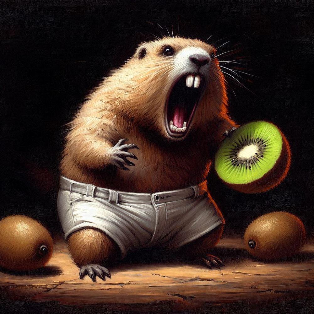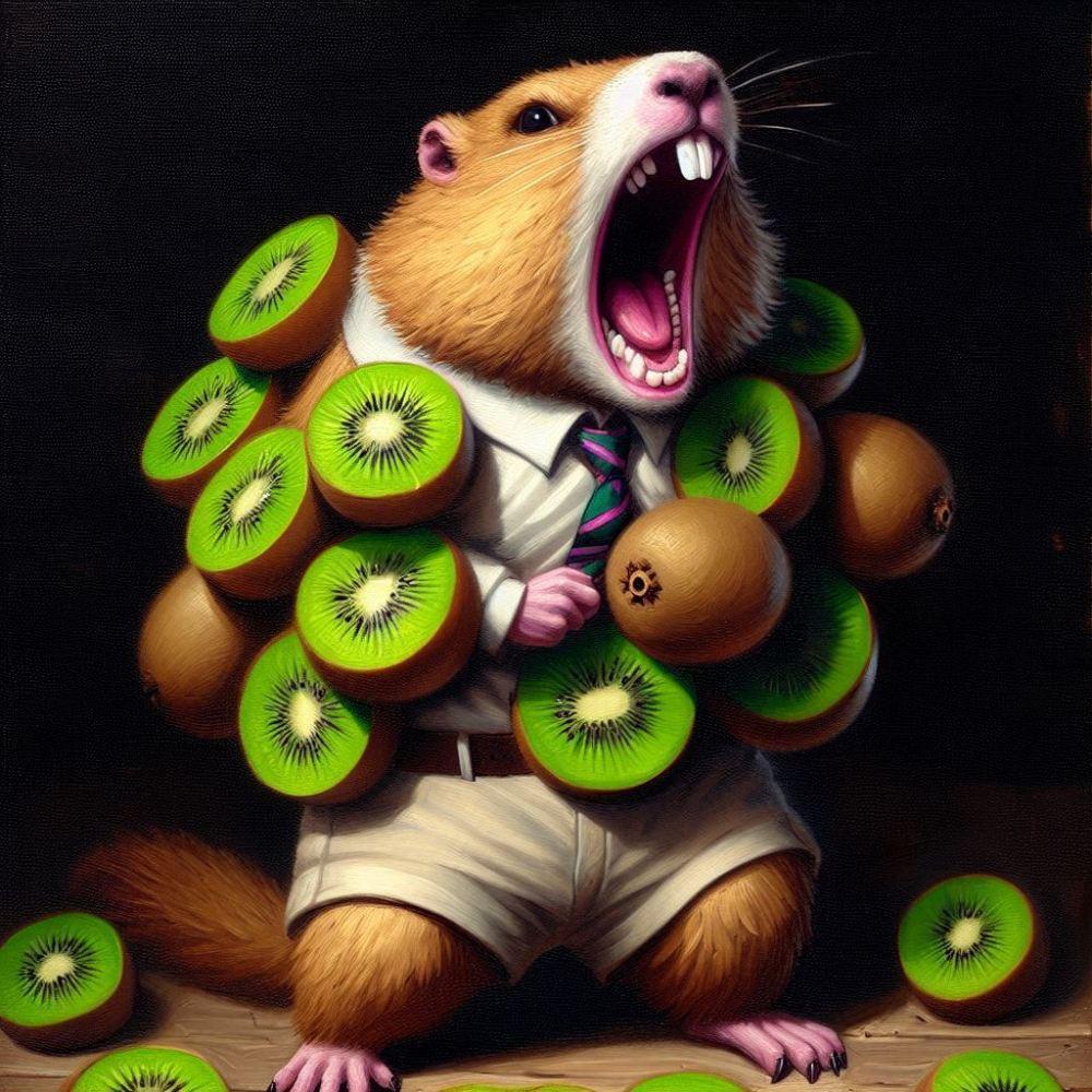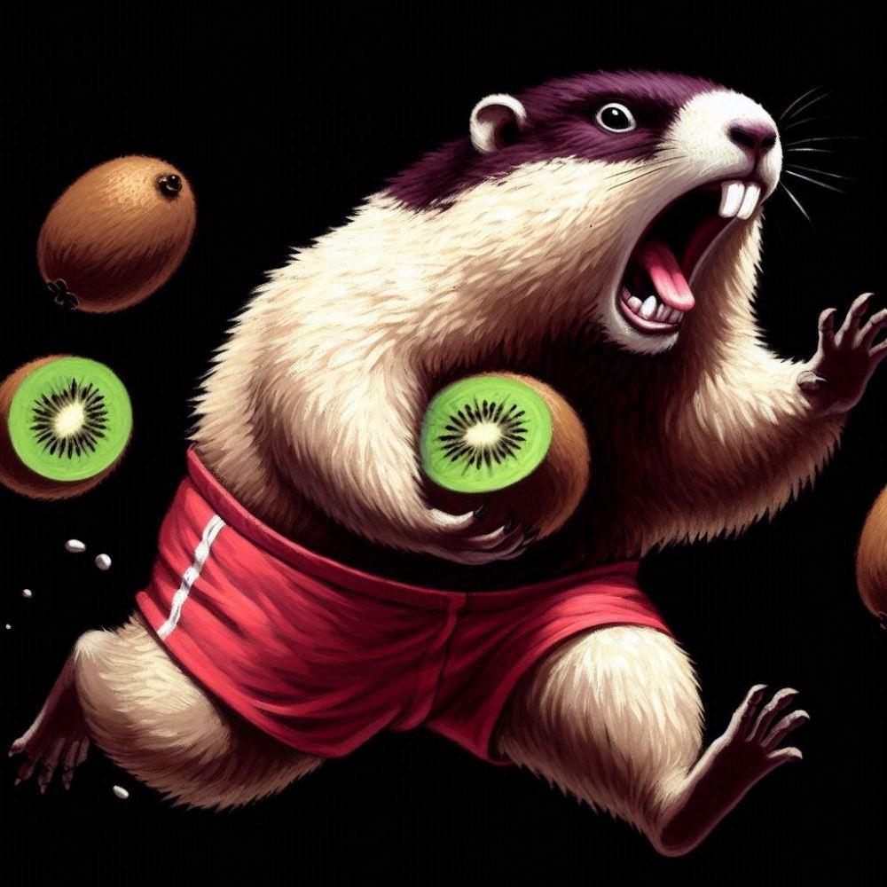 油絵風、キウイフルーツに追いかけられて走って逃げるショートパンツマーモット