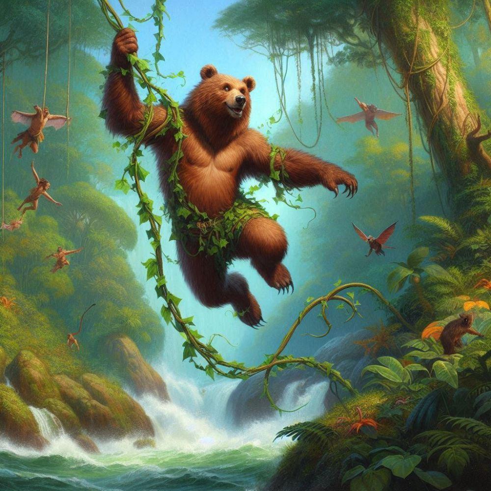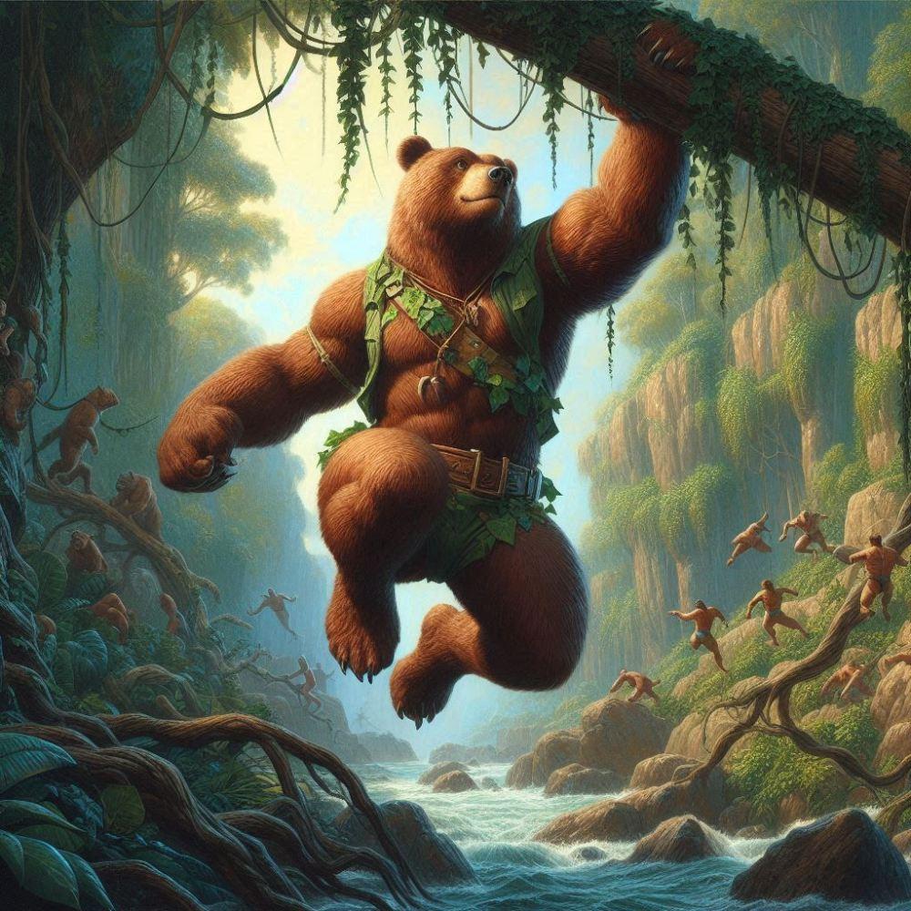 油絵ファンタジー、ターザンのコスプレをしたクマ