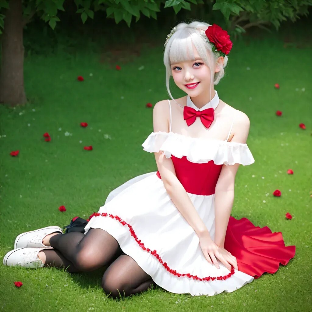 輝く太陽の下で、薔薇色のドレスを身に纏った少女が爽やかな笑顔を見せています。彼女の頭に飾られた花とドレスの裾にあしらわれた花々が、周囲の緑豊かな植物と調和し、明るい季節の訪れを告げているかのようです。彼女の姿は、歩む道すべてをポジティブなエネルギーで満たす元気の象徴です。