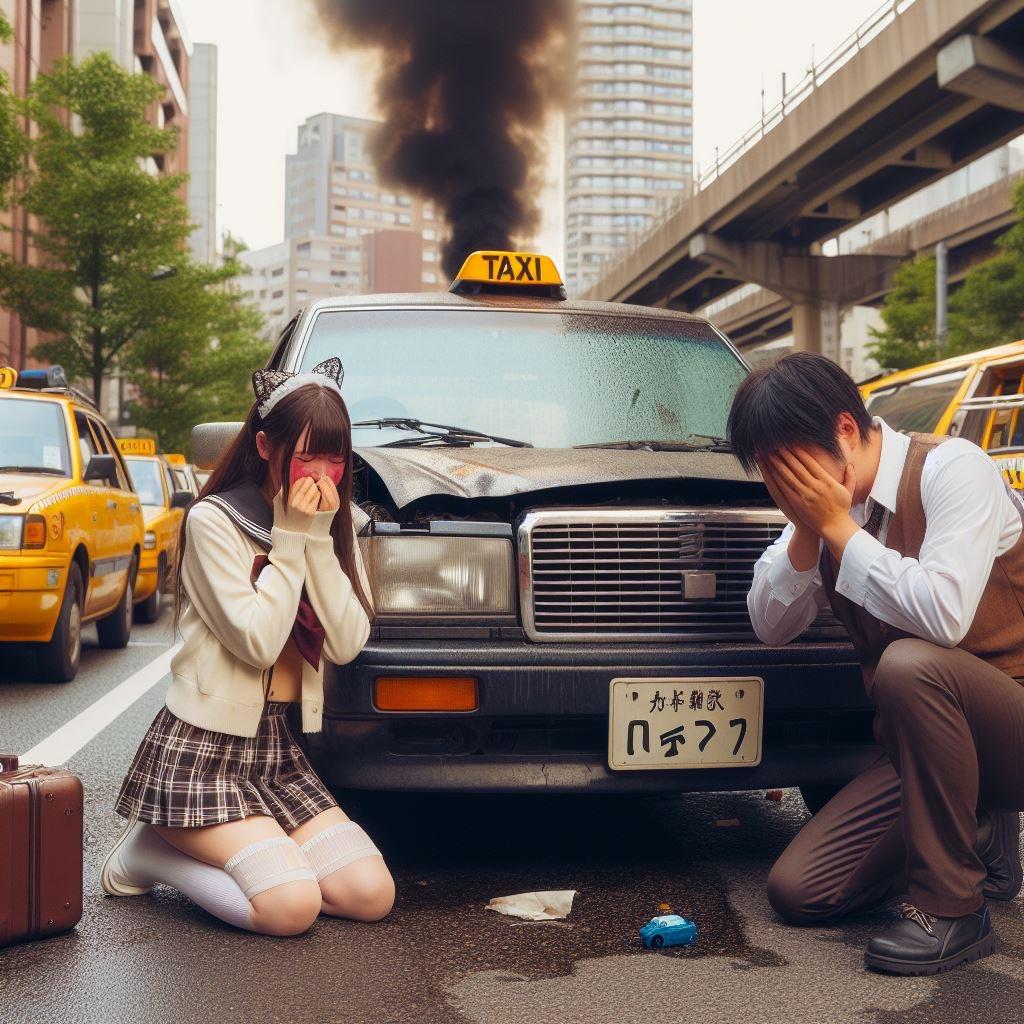 【謎画像】蹴られたタクシーが壊れて泣き崩れる女の子と運転手