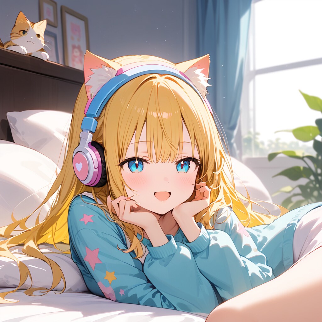 ヘッドホンから流れる音楽は、彼女の心を静かに包み込み、まるで夢の中にいるかのような気持ちにさせる。リズムに合わせて、彼女は指先で小さくビートを刻む。後ろの猫クッションたちは、彼女の気分に同調するかのように、温かく見守っている。