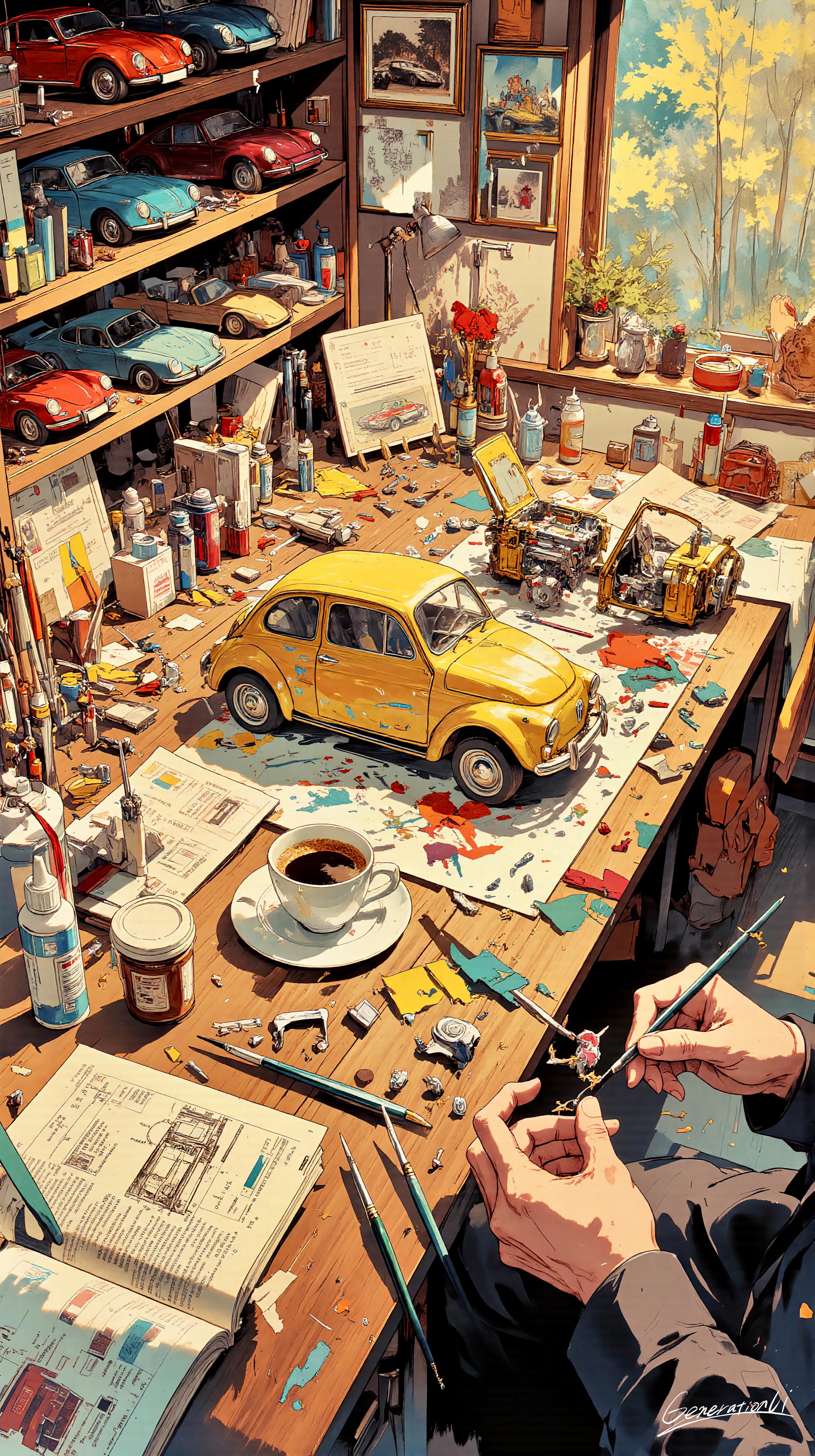 男子なら誰もが憧れるであろう秘密基地的な小部屋で、趣味の模型作りに没頭する至福の時間・・。雑然とした机の上も、なんかいい感じですよね。たまにはこんなイラストをスマホの壁紙にしてみてはいかがでしょうか。きっと気分も変わります。このイラストに合わせた短い物語もどうぞ。