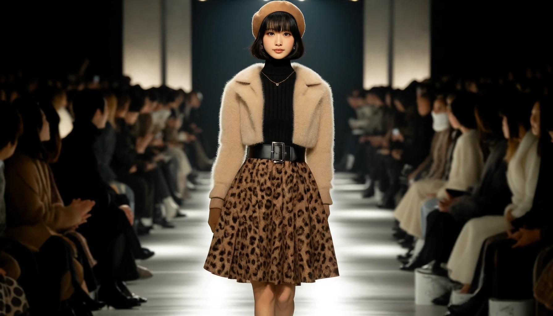 大胆なレオパード柄がスレンダーな彼女の体型を際立たせ、観客の視線を釘付けにします。フェイクファーのコートが柔らかさを添え、動くたびにコーディネート全体が洗練された美しさを放ちます。