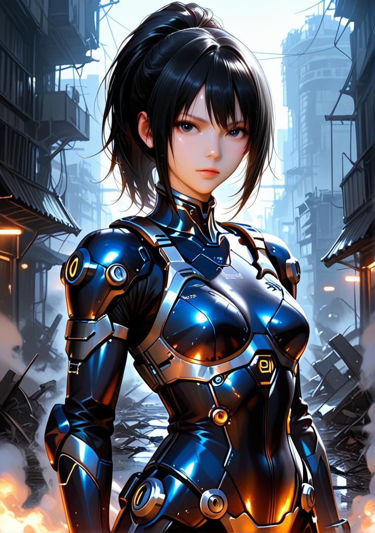 sapphire blue armored bodysuit with layered composite plating and soft glow seams # 複合層装甲と淡く光る縫い目を持つサファイアブルーの装甲ボディスーツ