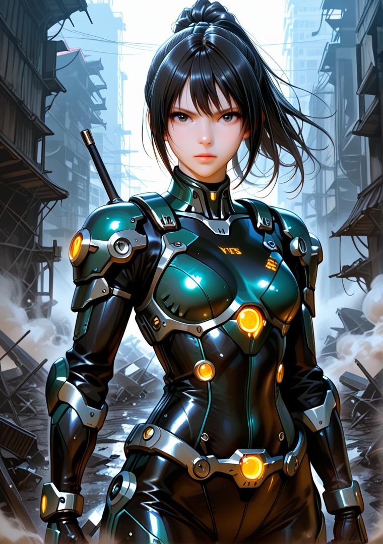 black exo-combat suit with reactive plating that shifts tone under light # 光に反応して色調が変化する装甲を持つ黒いエクソコンバットスーツ
