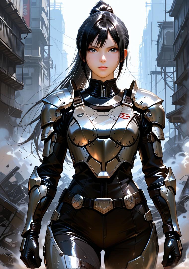 gunmetal gray tactical armor with fine mechanical detailing and panel seams # 精密な機械ディテールとパネル継ぎ目を持つガンメタルグレーの戦術アーマー