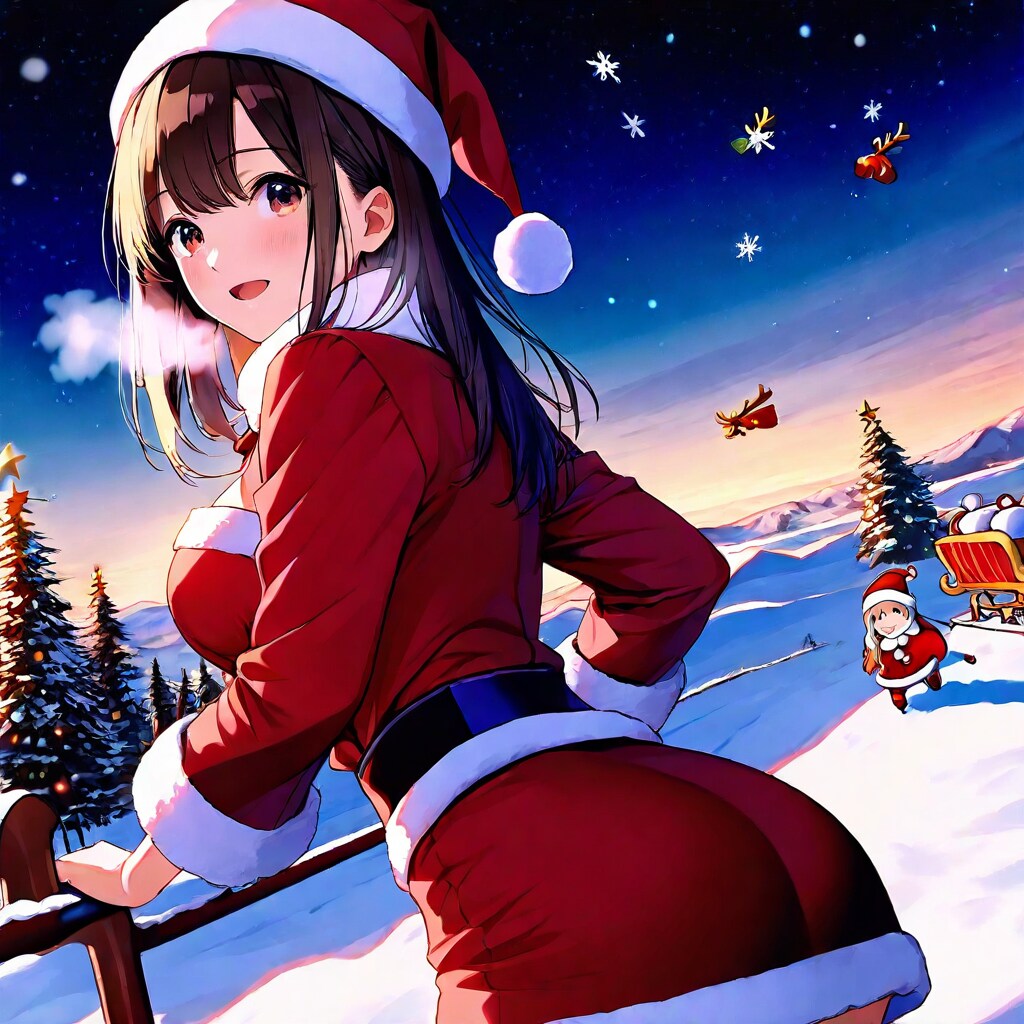 サンタガールさん……は分かるのですが、ソリ近くにいる謎のキャラと変な飛行物体が気になります