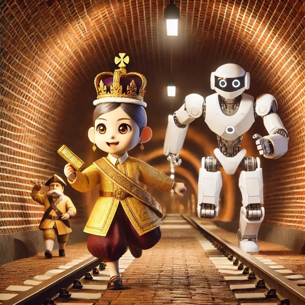 女の子の遊び心と、彼女を追う警備ロボットの真剣な任務感の対比が、シーンに楽しい緊張感を与えています。