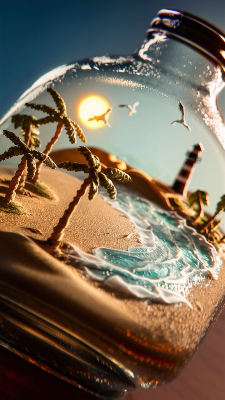 オリジナルプロンプトは「Sandy beach cut out in a glass bottle」