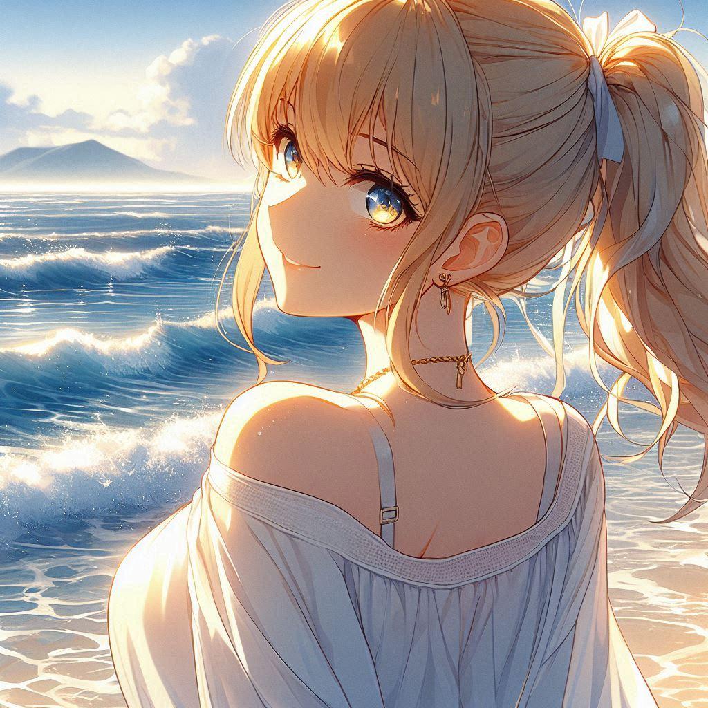 海辺で見返るエリザベス。うなじを見せるためにポニーテールにしてもらいました(´∀`)