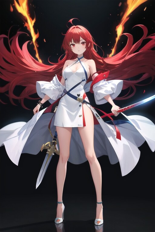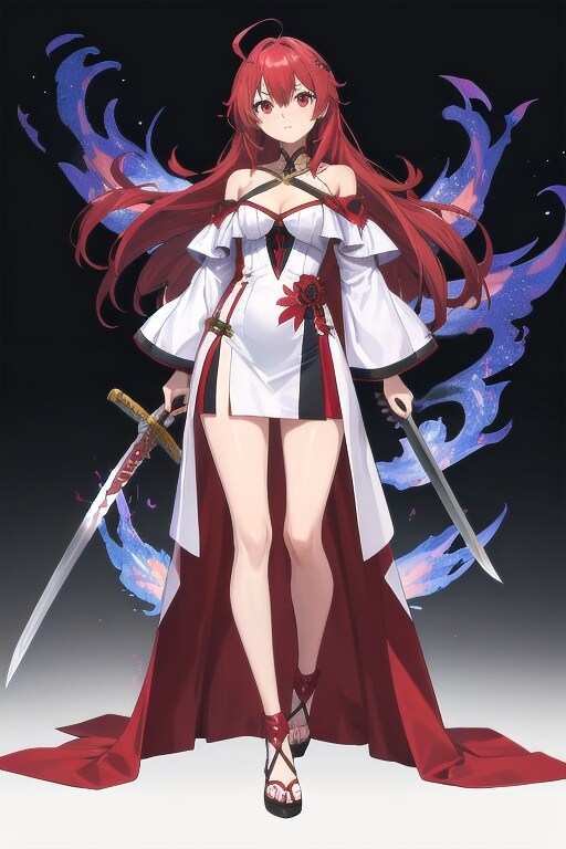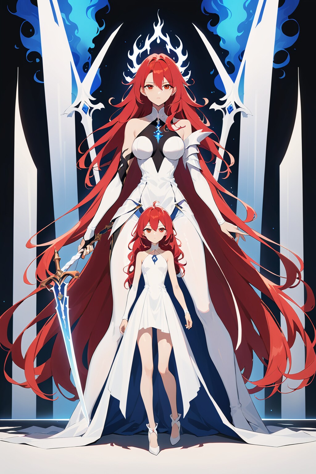 エリザベス・ローズ・ブラッドフレイム、赤い髪、ロングヘア、赤い目、騎士のような出で立ち、白いドレス、黒いオフショルダートップス、デコルテに青い炎、左右非対称なパンプス