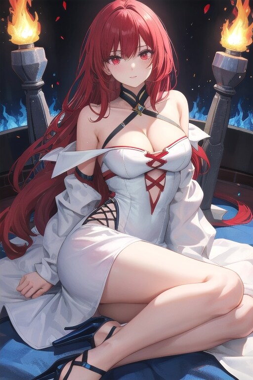 Elizabeth Rose Bloodflame, red hair, long hair, red eyes, knight-like outfit, white dress, black off-the-shoulder top, blue flames on the décolletage, asymmetrical pumps