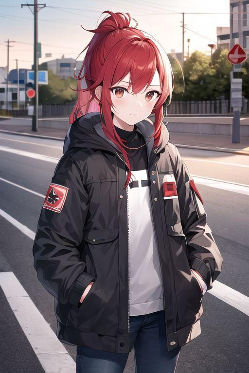 赤髪ポニーテールの少女が男物のフライトジャケットを着ているイメージで作ってみた