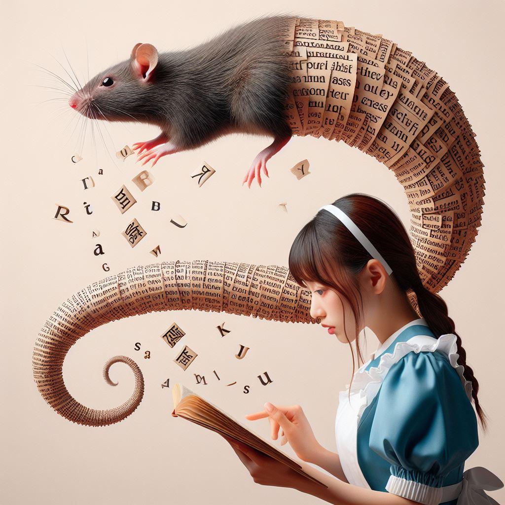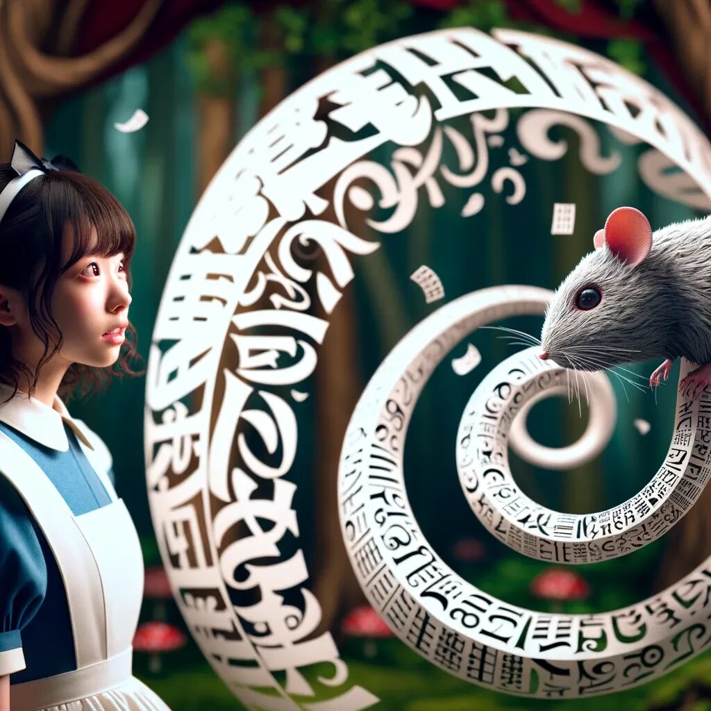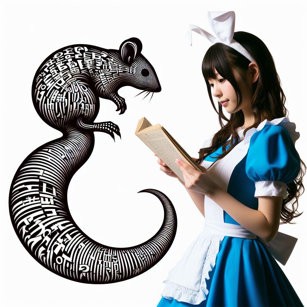 アリス昔読んだんですが、ネズミと話すシーンの文章がネズミの尾の形になっているのが衝撃的で「なんだこれは」となったのを覚えています。ヘンテコで自由で大好きなこのシーンをどうしても再現したくなってしまったのです。