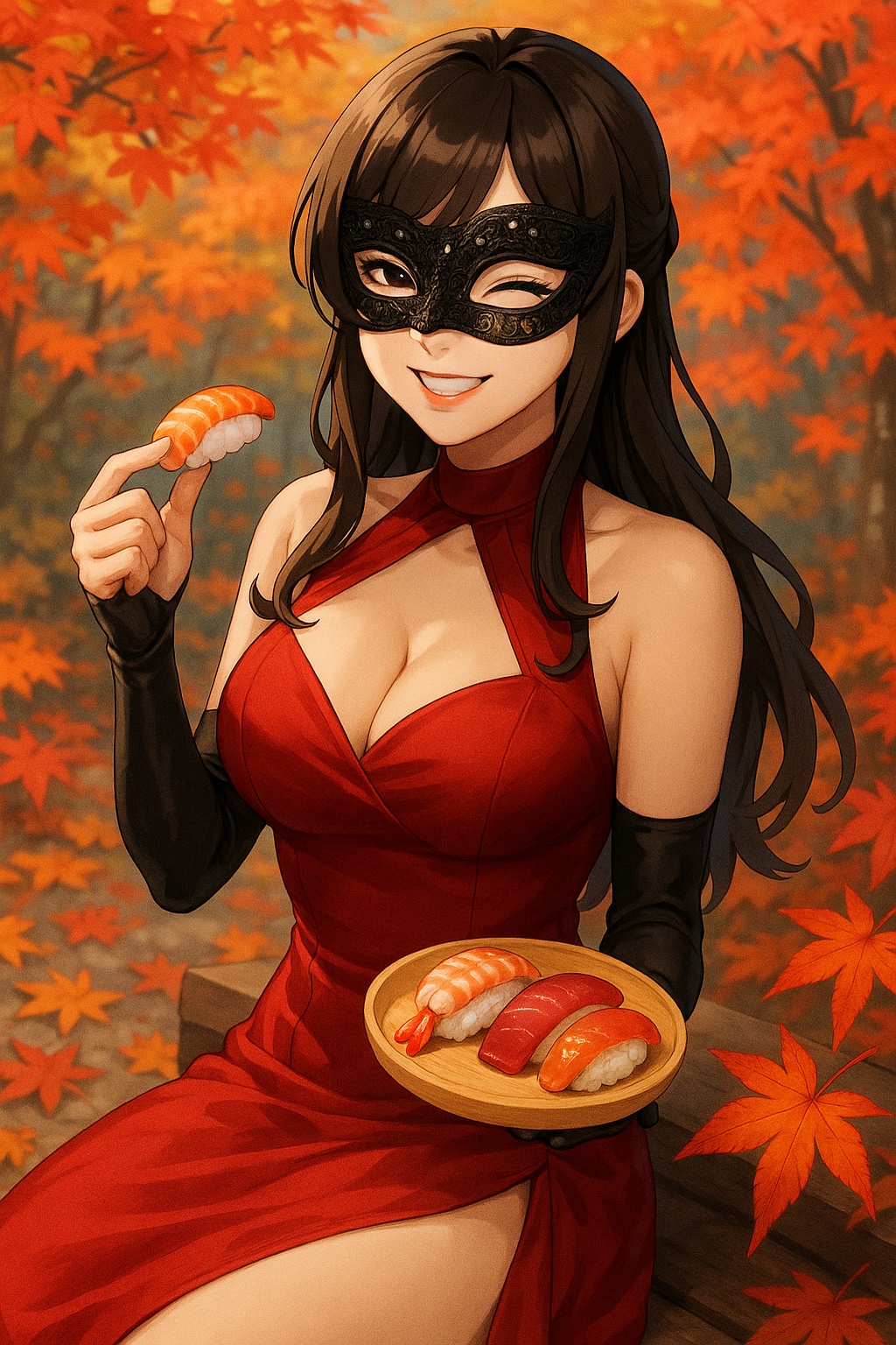 紅葉に囲まれてひと休み。寿司を手にした怪盗の微笑みは、どこか子供っぽくて愛らしい。