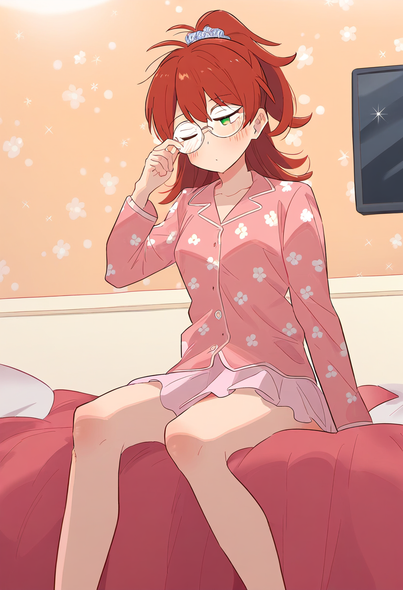 妹キャラの緋山芳華です。前にも書いた通りうp主は赤髪ポニーテールっ娘が好きなので、それが理由で生まれた娘でしたが、最初は赤髪ポニーテールっ娘は一人だけの予定でしたが、巨乳か貧乳かで大いに悩んでいました。そしていっその事「姉妹キャラしよう」と言う考えに至り、緋山芳華は生まれました。ただ、貧乳にするだけでは姉妹とは言え見た目の差が無さ過ぎるので、髪のプロンプトに「messy hair」を加えたり「droopy eyes」を「slanted eyes」に変えたり細かい違いを出しています。