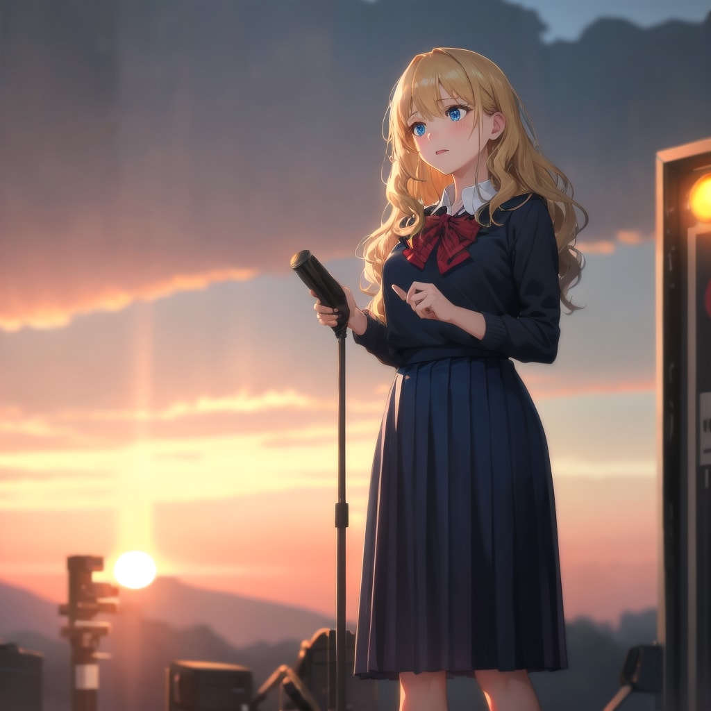 夕焼けに染まるステージで、3年間の感謝を語るちちぷいちゃん。風に髪がなびき、涙をこらえながらも優しく微笑む姿に、観客の拍手が響きます。