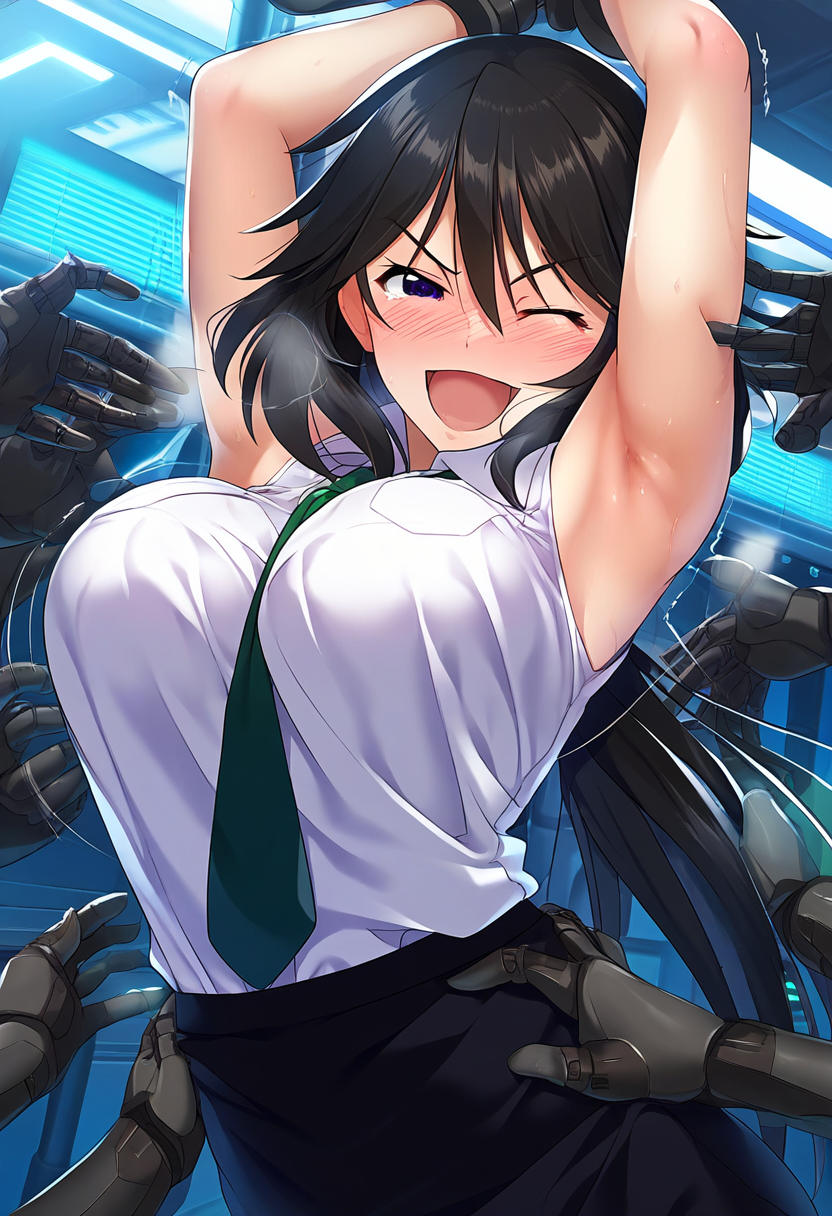 ・機械の手のくすぐりは「tickle」ではなく「grab(掴む)」にしています。部位はarmpits(脇の下)とtorso(腰)。巨乳キャラの場合、アングル次第では胸に手が行きがちなため、「from above(上視点)」など入れた方が良いかもです。