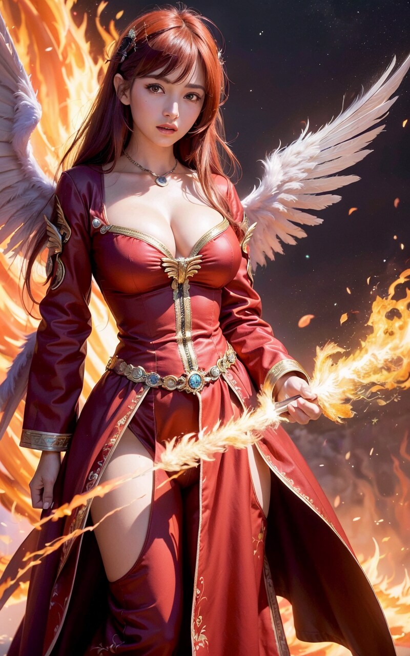 もっと羽根とか炎とか、なんなら羽根とか体の一部も燃えているような表現にしたかったのですが、実写系モデルだと難しいですね。