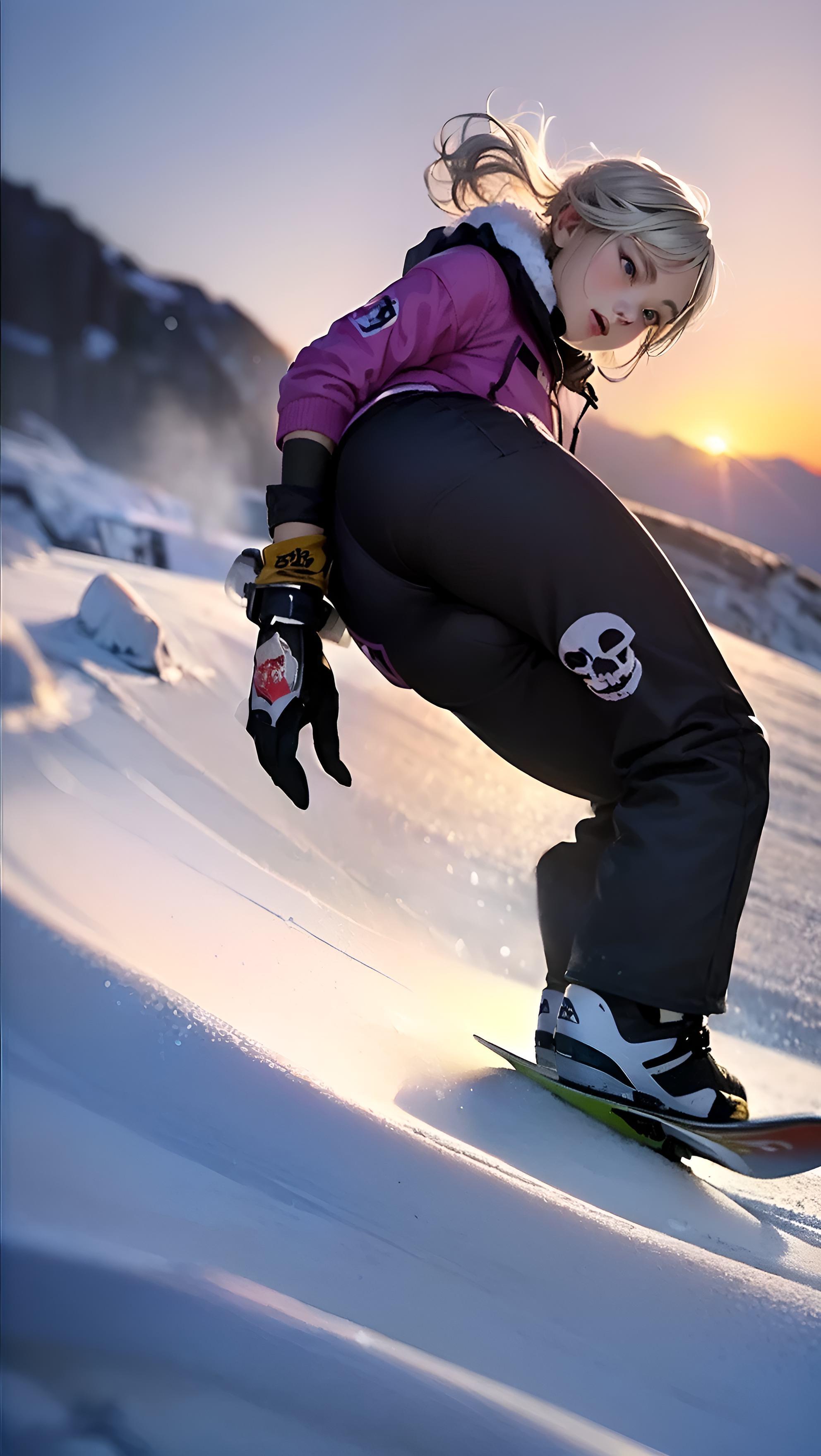 スノーボードは重量に比例、少し長め、1つの板に乗る事が重要であり、彼女は空中トリック用のフレキシブルのスノーボードを装置してます。空中姿勢を維持します。