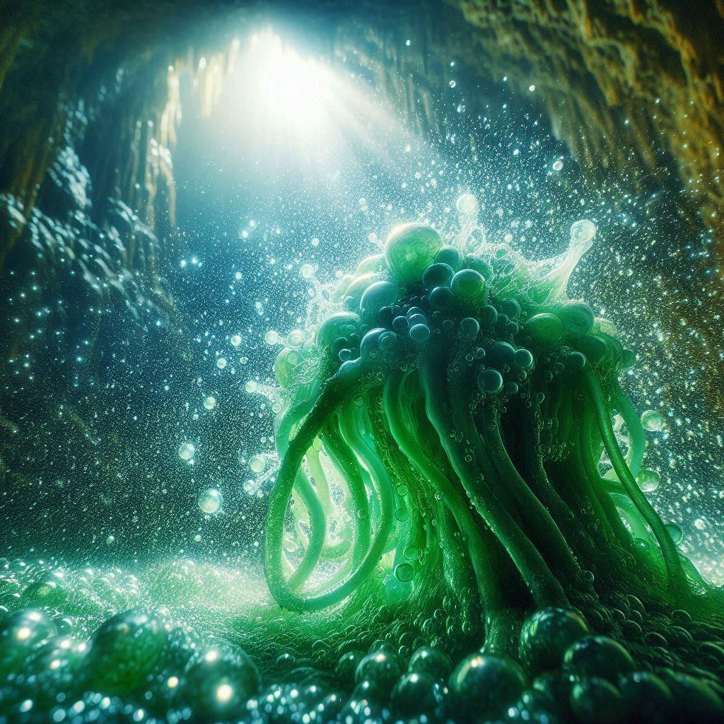 生態:外見は透明な青緑色で、泡が内部から浮かび上がる様子が特徴的です。触手のような構造を持ち、その先端には小さな光る球体がついています。この光る球体は、ソーダ水の泡のようにキラキラと輝きます。
