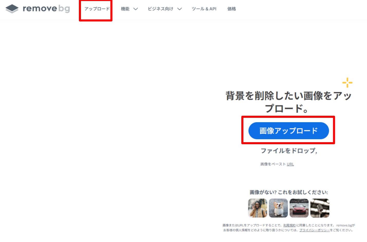 ③アクセスしたらアップロードより背景を消したい画像をUpします。