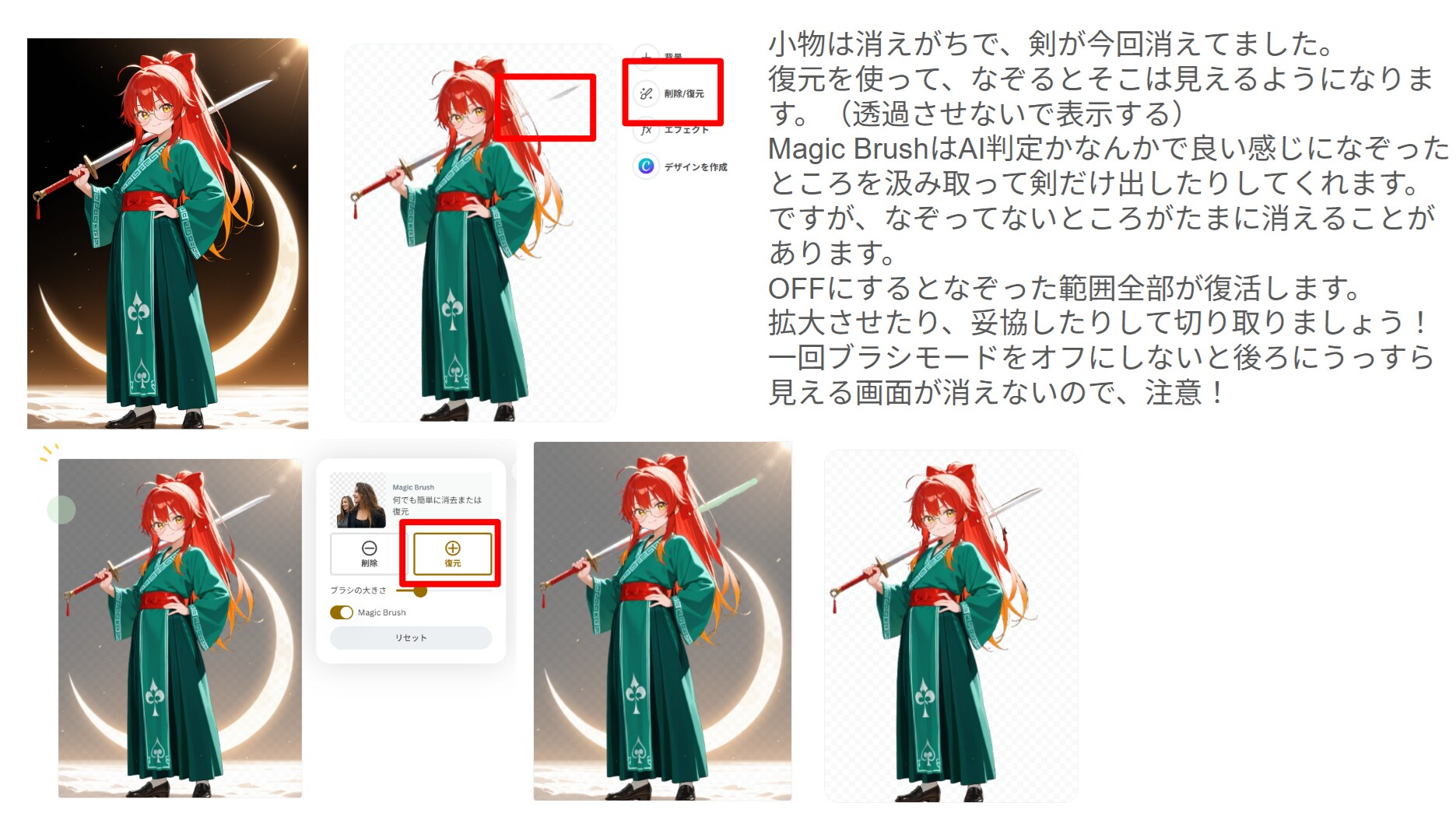 MagicBrushをOFFにすれば、完全になぞったところが復元されます。なぞりミスすると背景の黒い部分も出てきます。