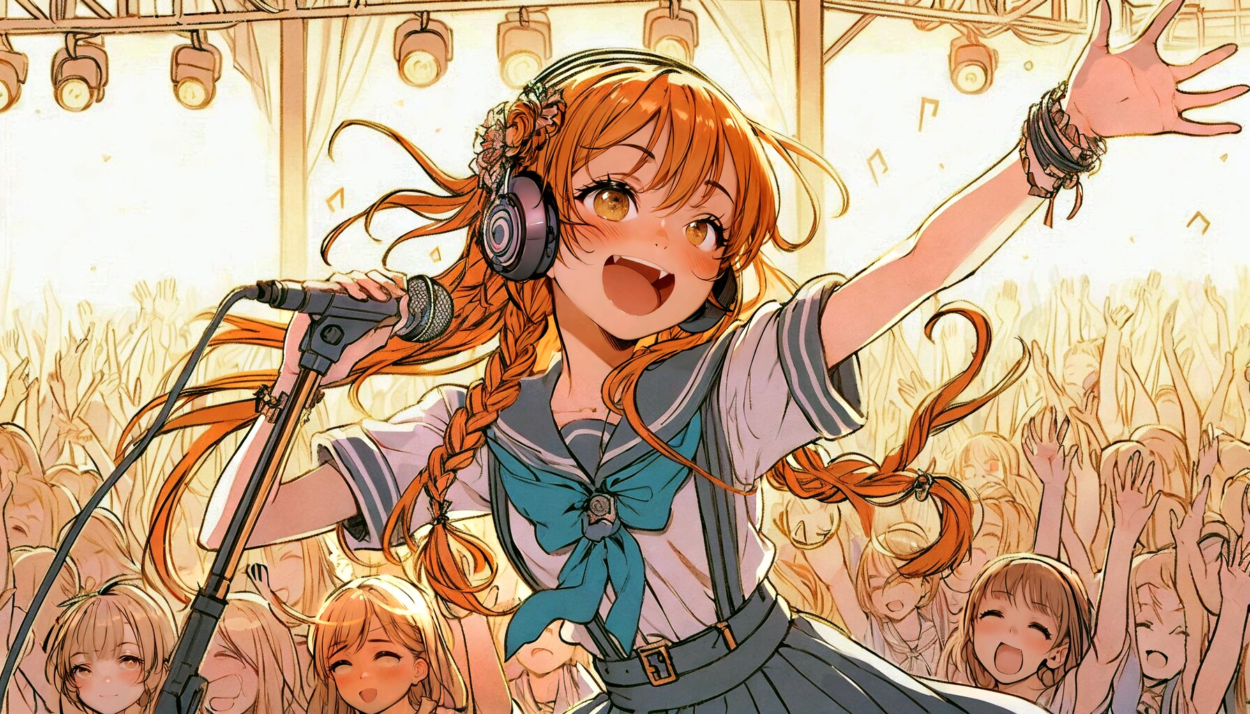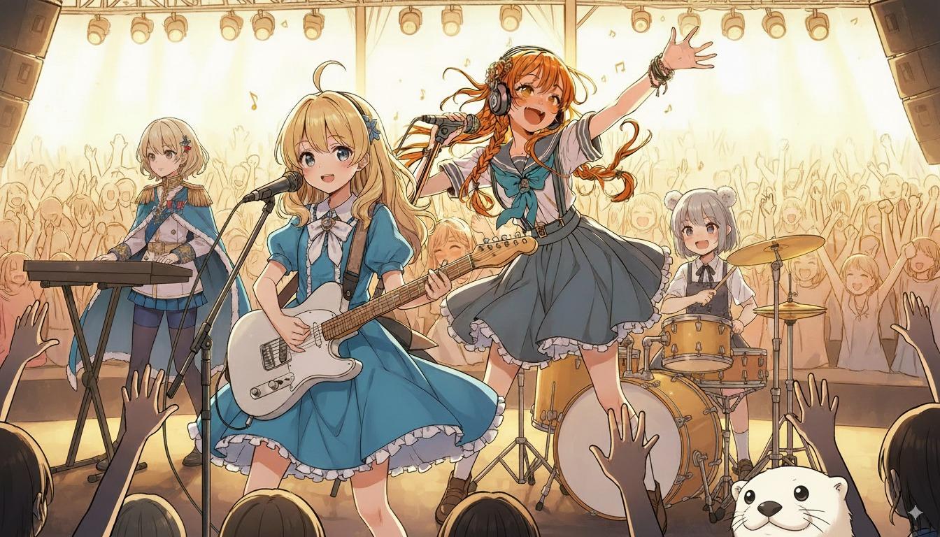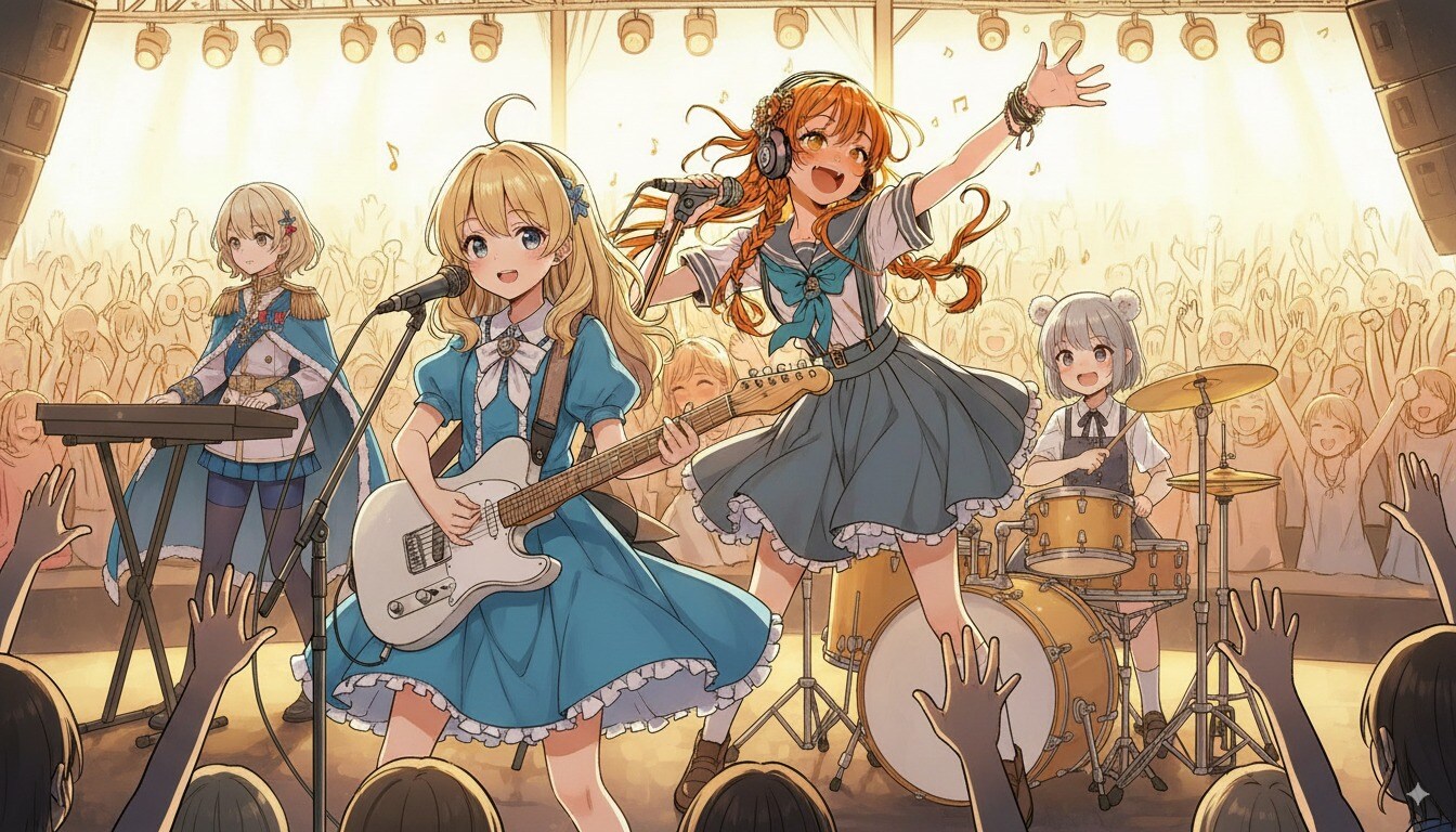 「この4人のキャラクターが仲良くバンド演奏している絵を作ってください。」
