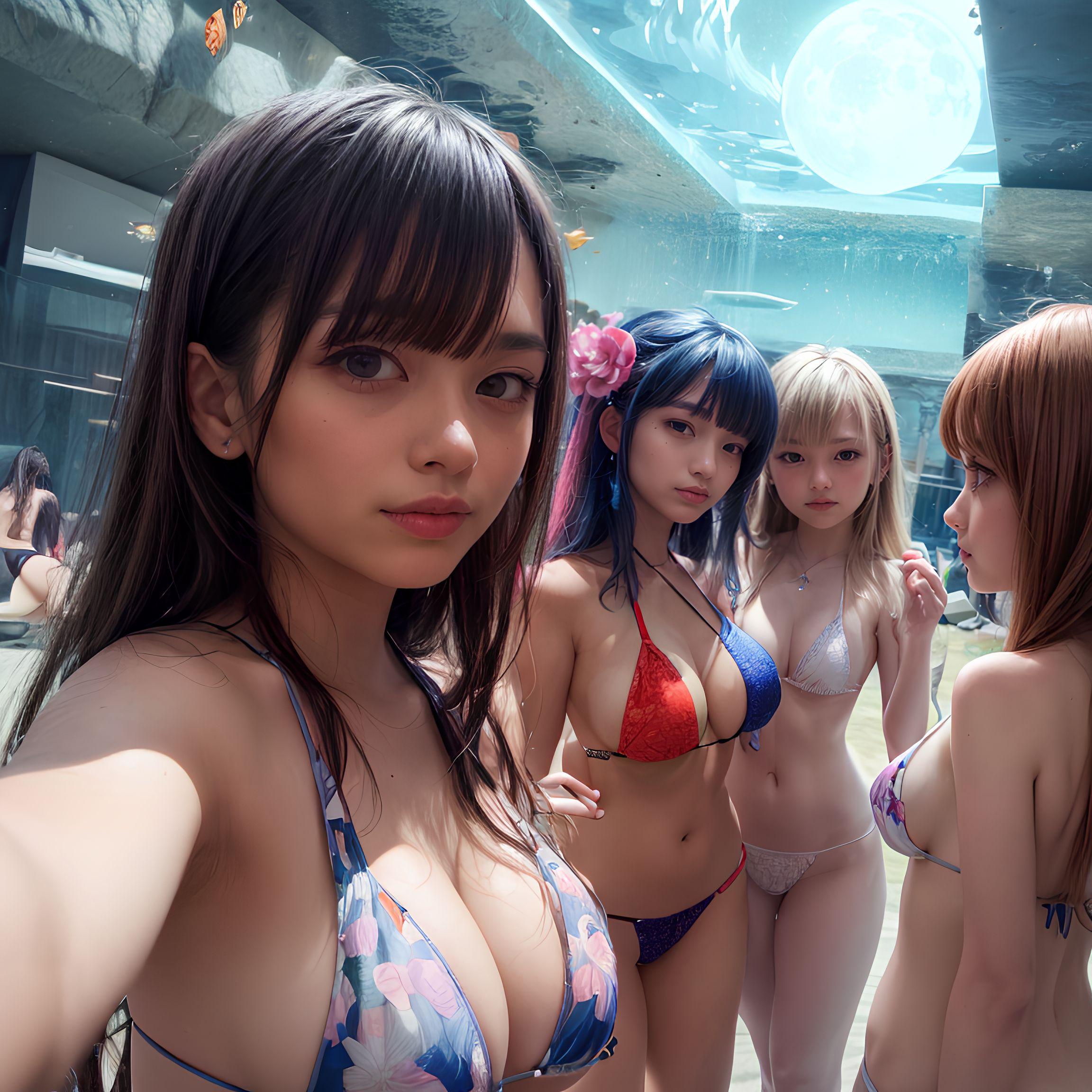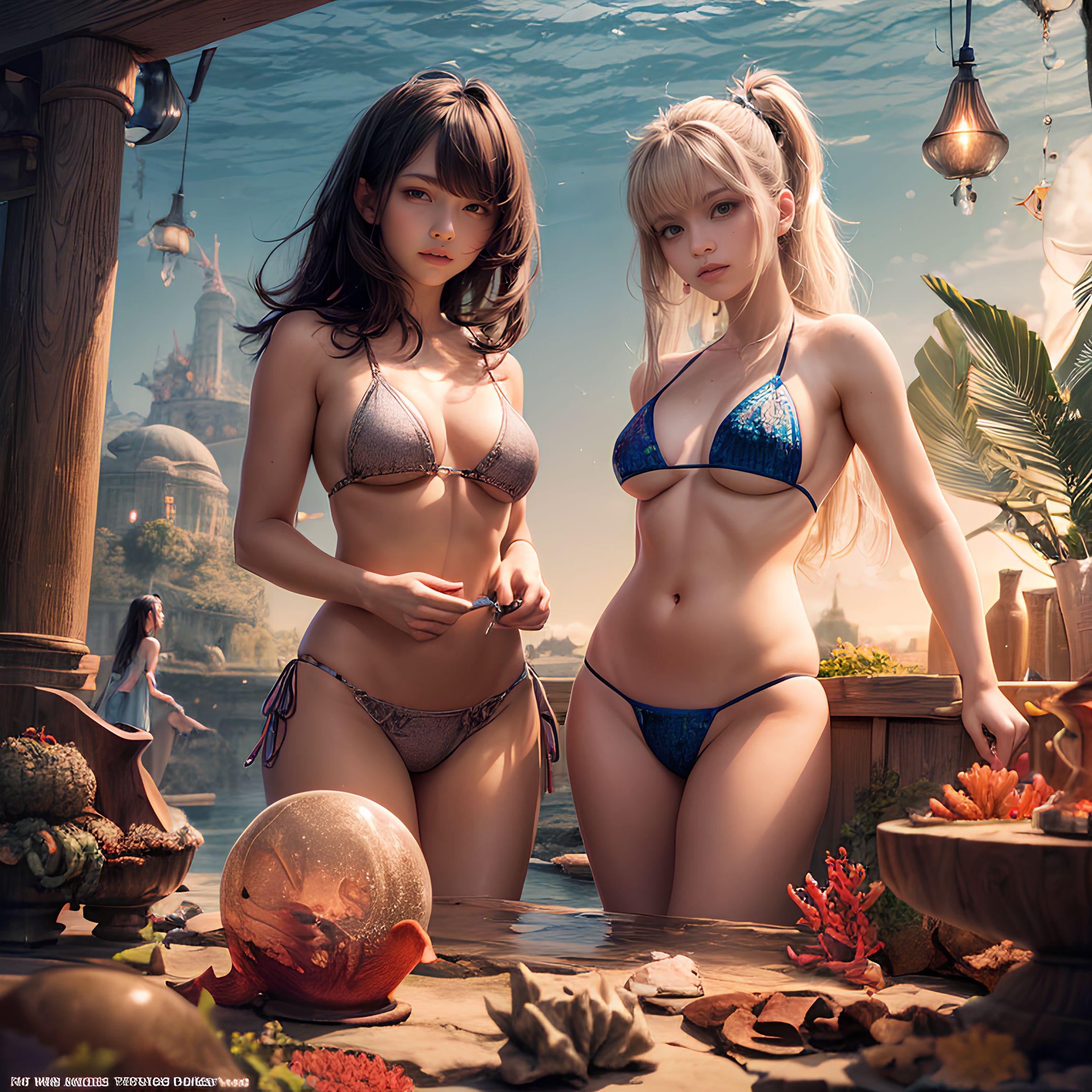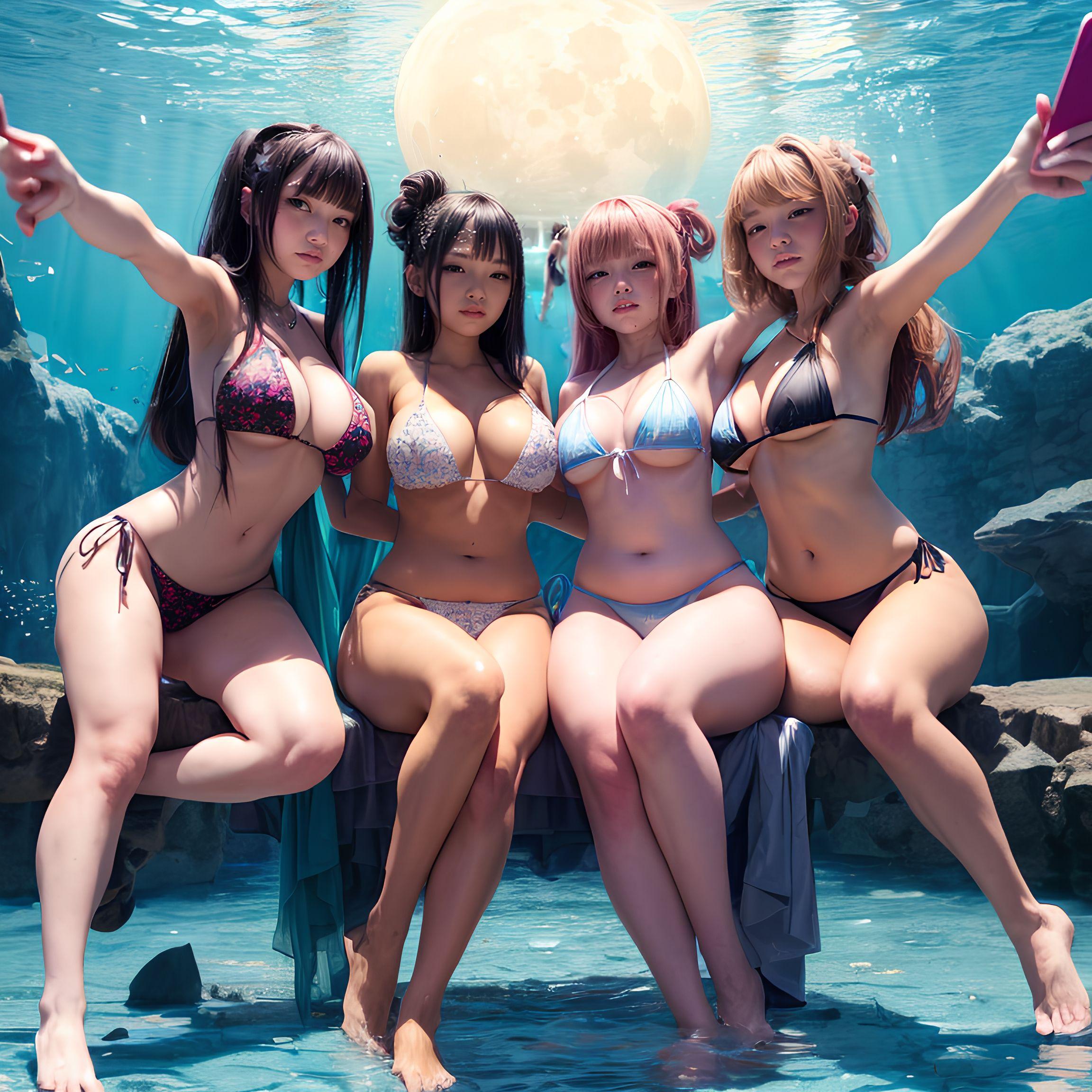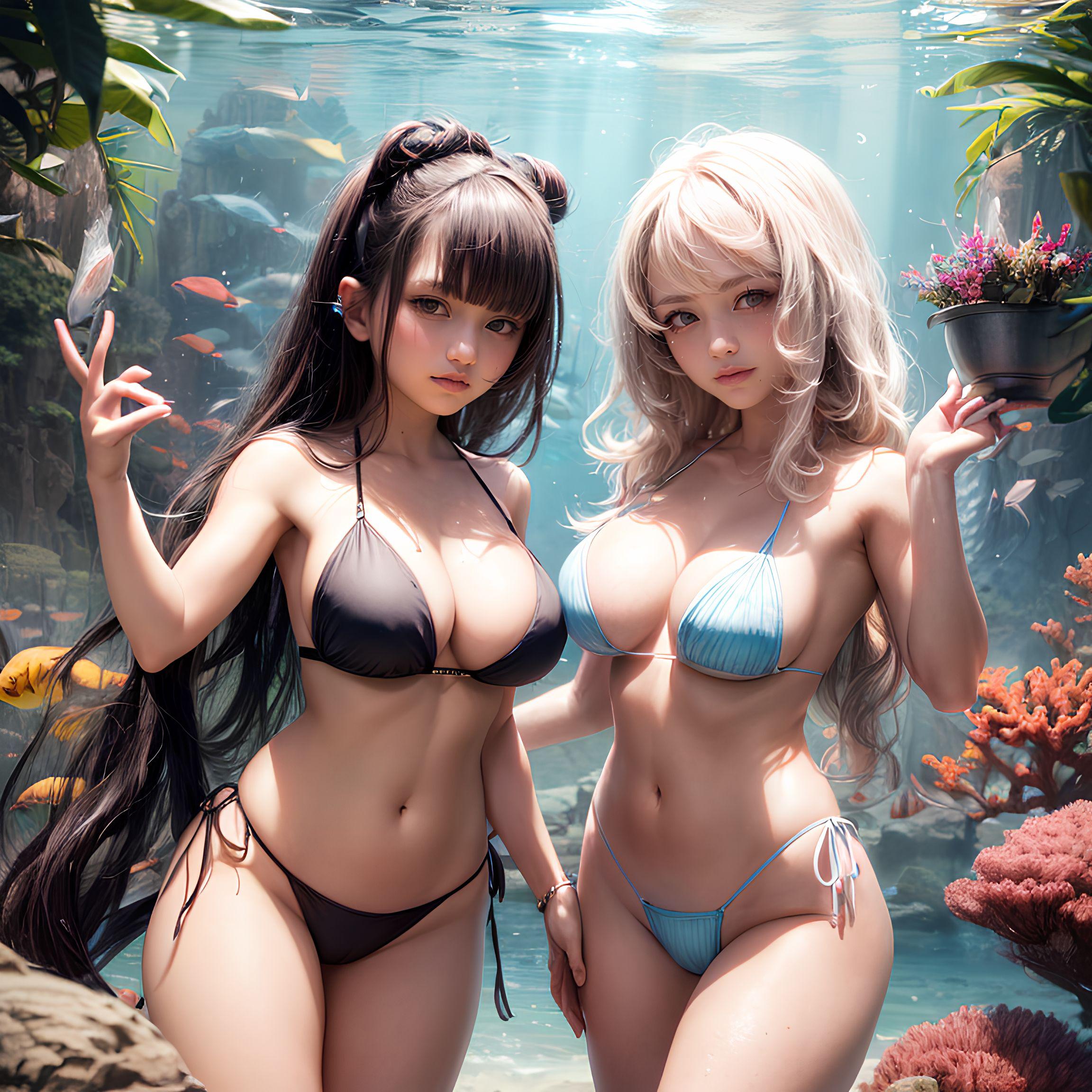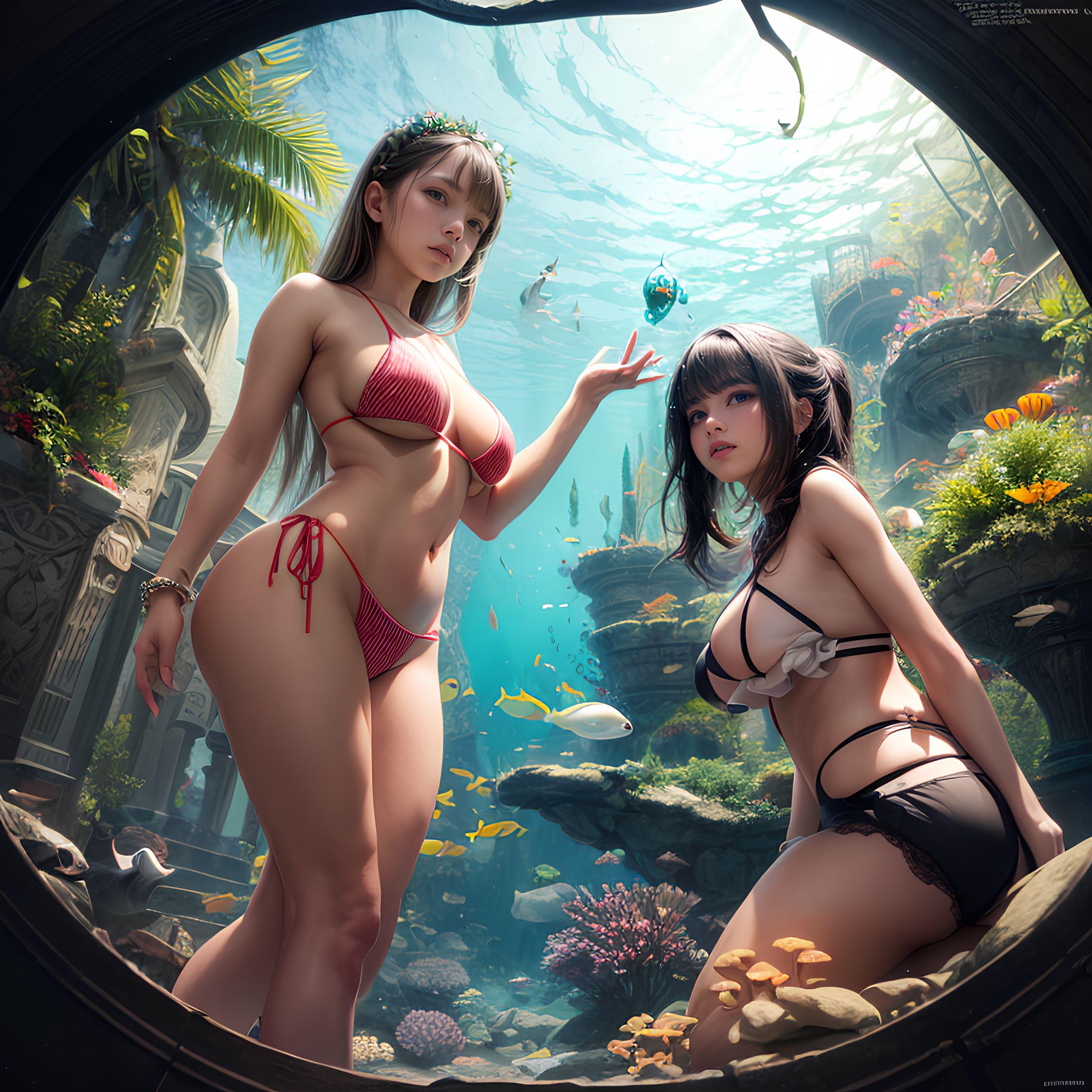 幻想的な水中世界の夢幻に浸る海の日の美少女たちと美しい珊瑚の下で出会う魚たち