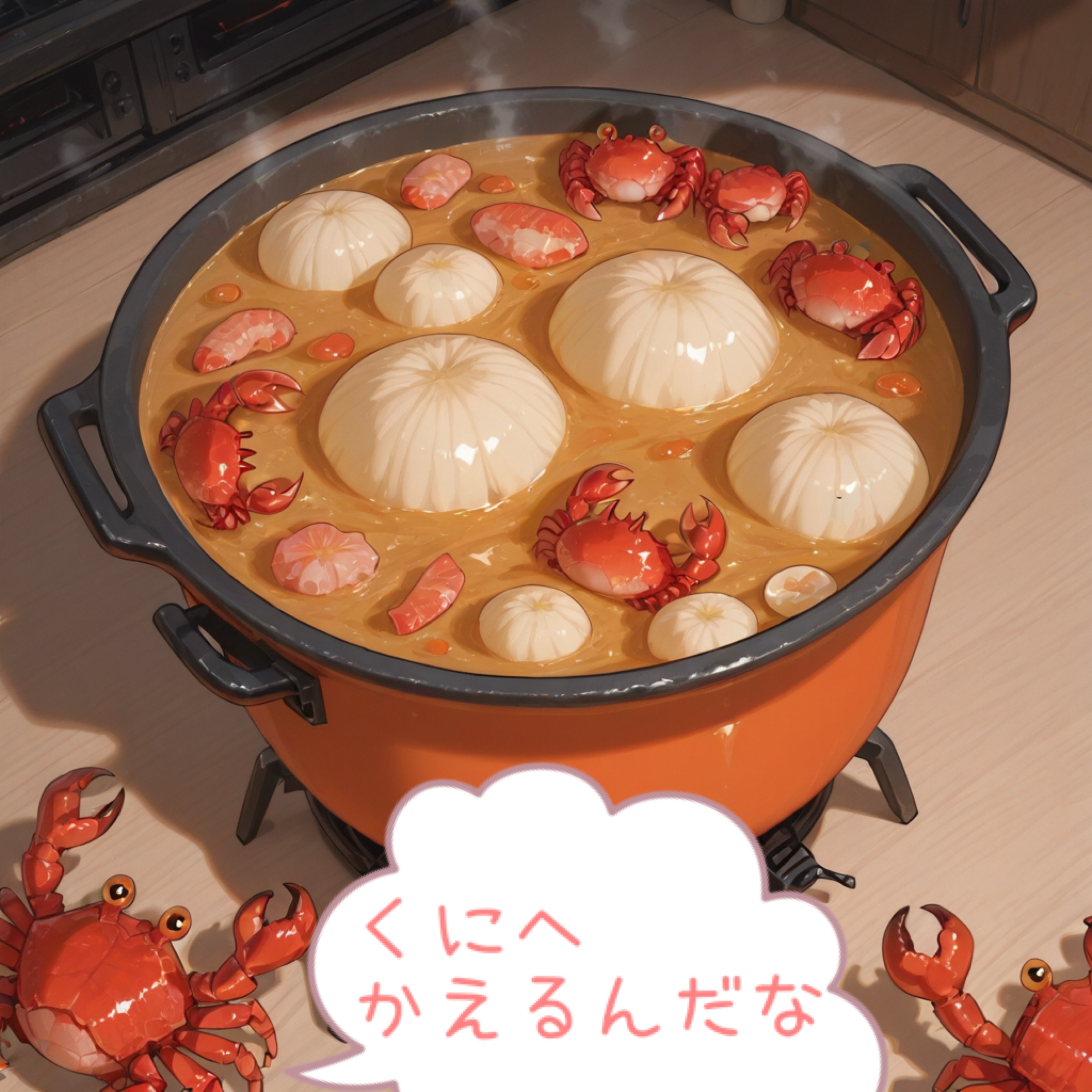 「かにをくえるんだな」と「くにへかえるんだな」を見間違えたので、鍋から脱出して海へ帰ろうとするカニさんを…_(┐「ε:)_