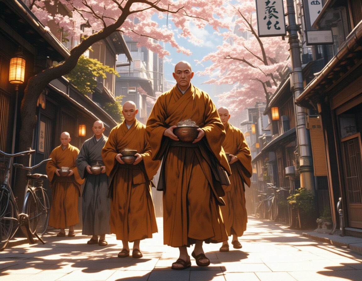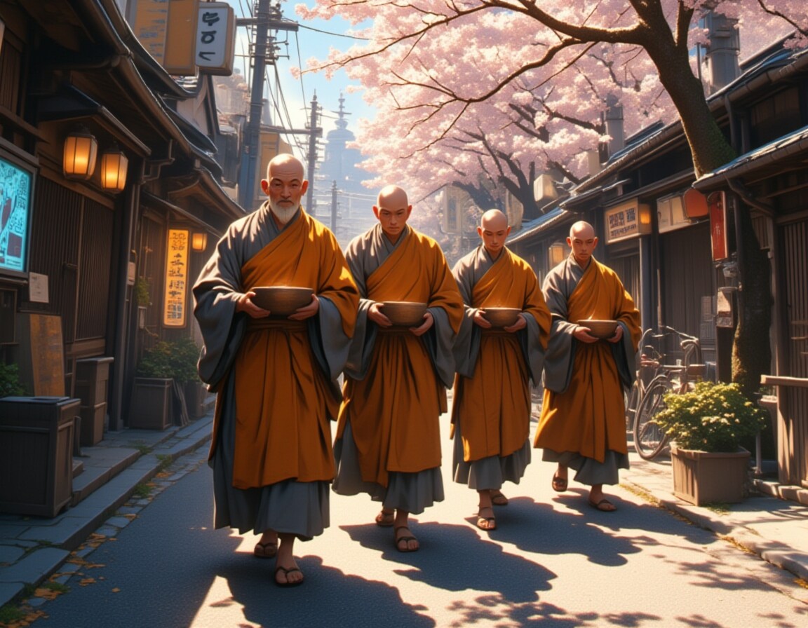 A cinematic wide-angle shot of five Buddhist monks walking in a single-file line through the modern streets of Kyoto,Japan. Each monk has a freshly shaved head and wears traditional ochre and gray robes,holding an alms bowl in both hands as they silently proceed with deep concentration. The elderly head monk leads the procession,his wise gaze fixed forward,while the younger monks follow in perfect harmony,their footsteps synchronized. The background captures Kyoto’s blend of modern and traditional elements—narrow streets lined with wooden machiya houses,neon-lit signs,and bicycles parked along the sidewalk. Soft morning sunlight filters through cherry blossom trees,casting delicate shadows on the pavement. The monks' peaceful presence contrasts with the busy city atmosphere,creating a serene yet dynamic composition. Ultra-realistic details,professional depth of field,National Geographic-style documentary photography,cinematic framing.,