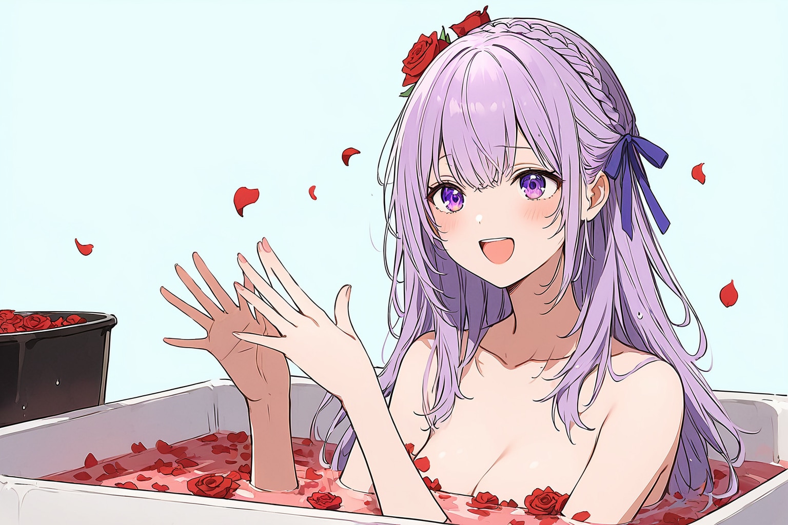 普通のお湯でもちゃんと隠してくれるけど、どうせならやっぱりゴージャスにいこう!というわけでバラの花びらが浮く「バラ風呂」に挑戦しました。けどバスタブがちっさいよ(笑)