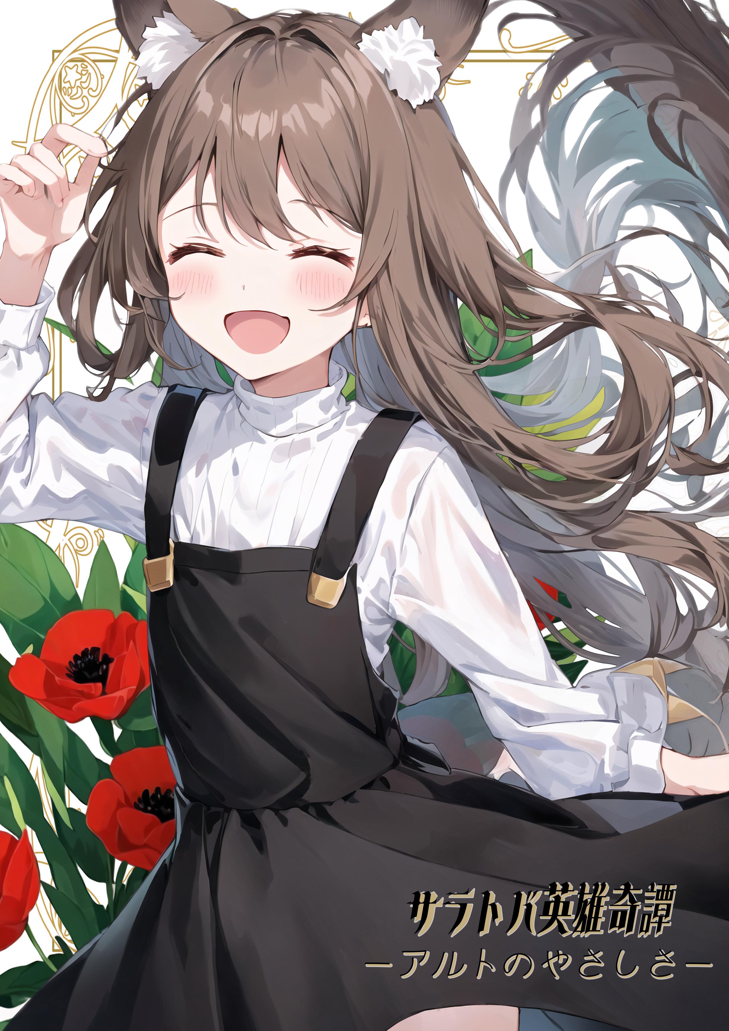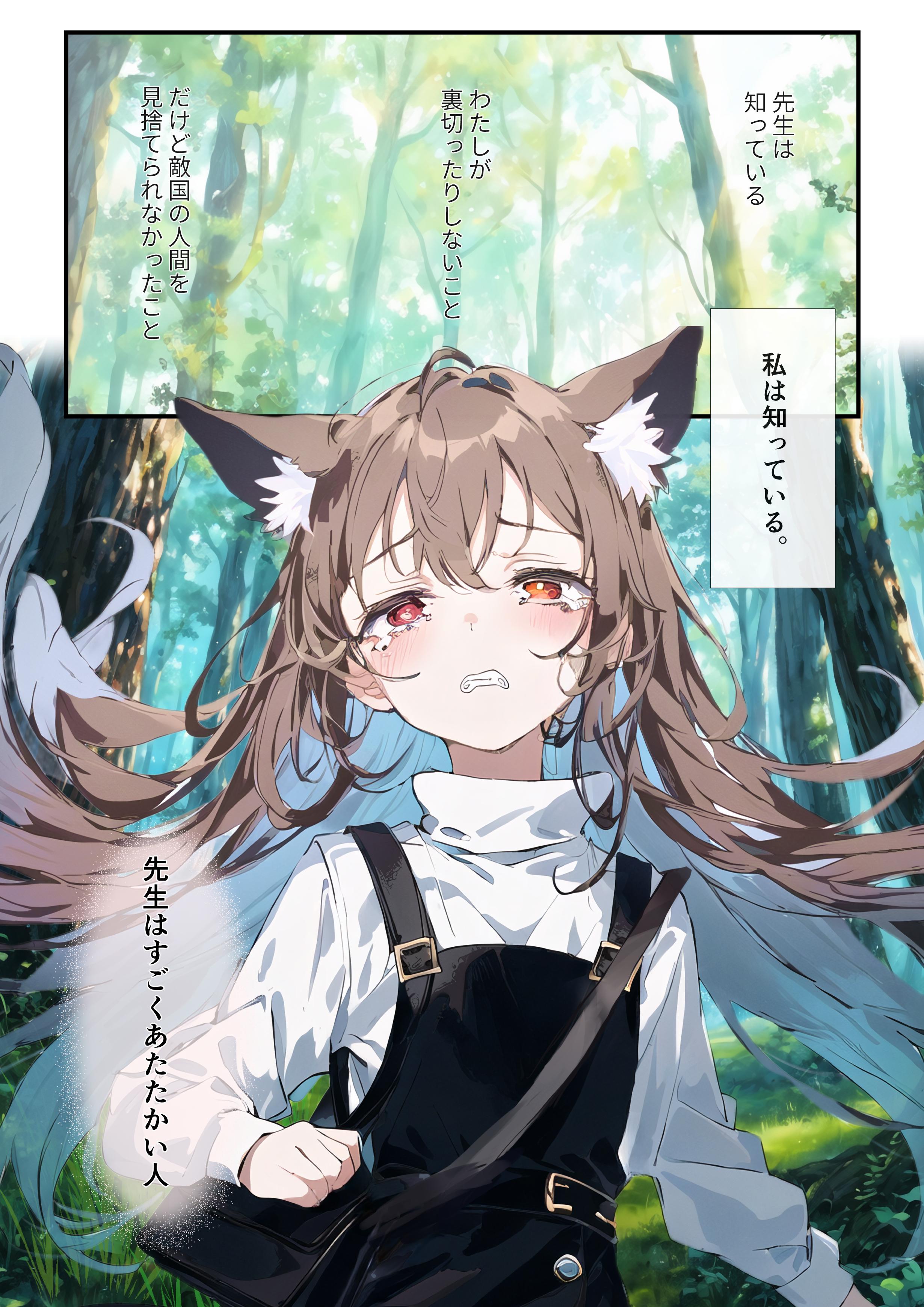 プロンプトが"10yo loli 1girl with (pale brown long hair:1.2) and brown fox ears,(tareme:1.2),flat chest,white turtleneck blouse,//,black pinafore dress,brown fox tail"なのできっと10歳くらい。笑