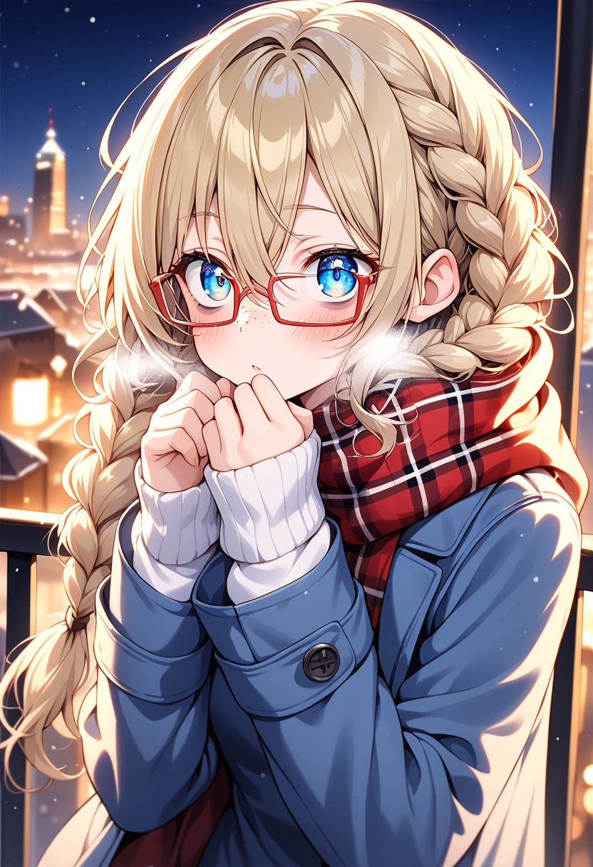 breathing on hands, plaid scarf, coat,で冬間を追加。