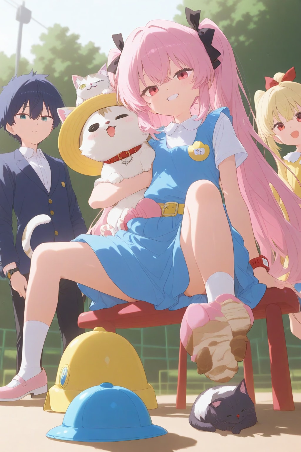 猫はじたばたと前足を動かしつつも、女の子の腕から逃げ出せない。女の子はその様子を見下ろしながら、小さく鼻を鳴らした。「ふふん、せっかく抱っこしてあげてるのに、感謝しなさいよね?」猫は目を細め、諦めたようにため息をついた。