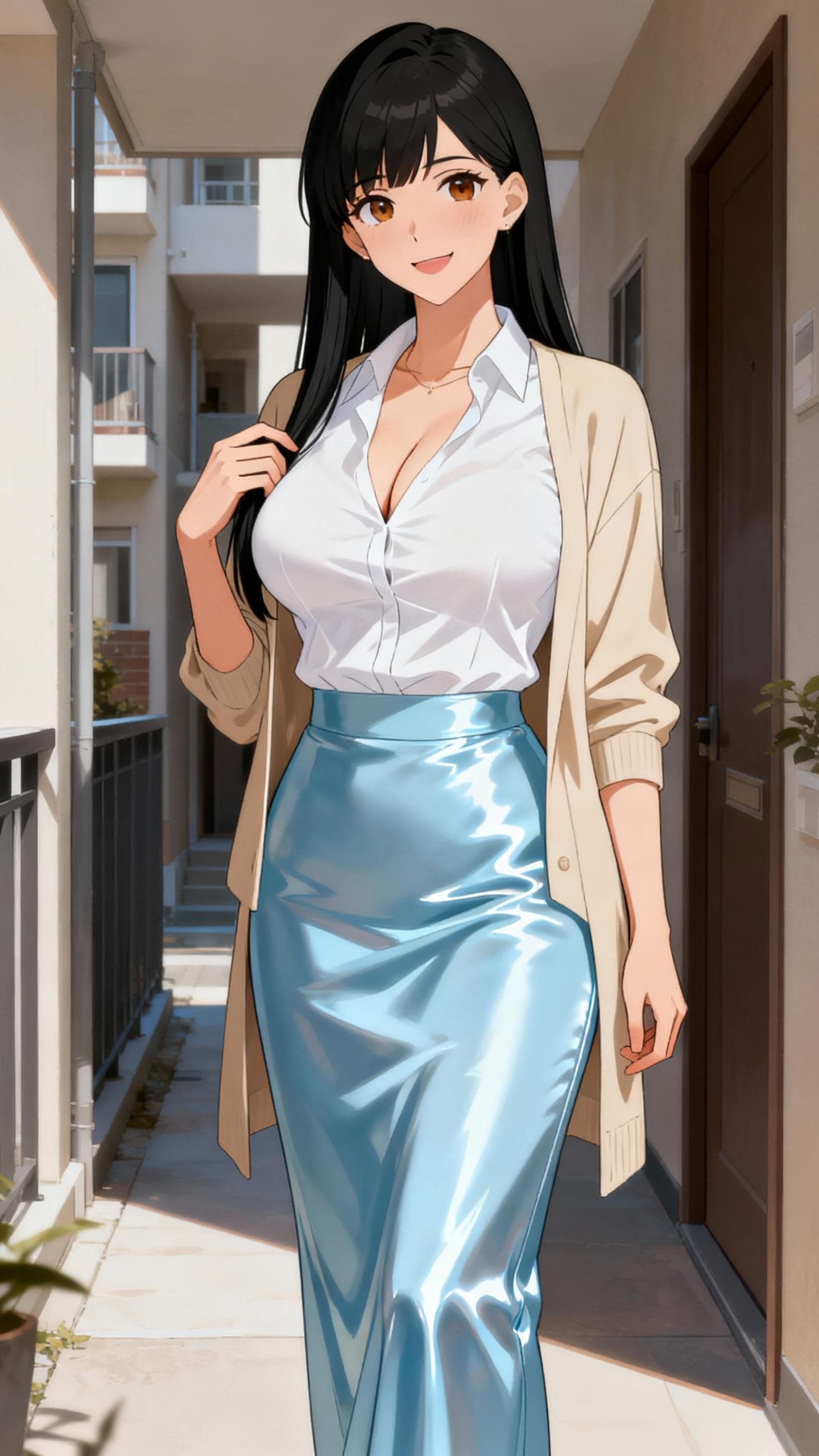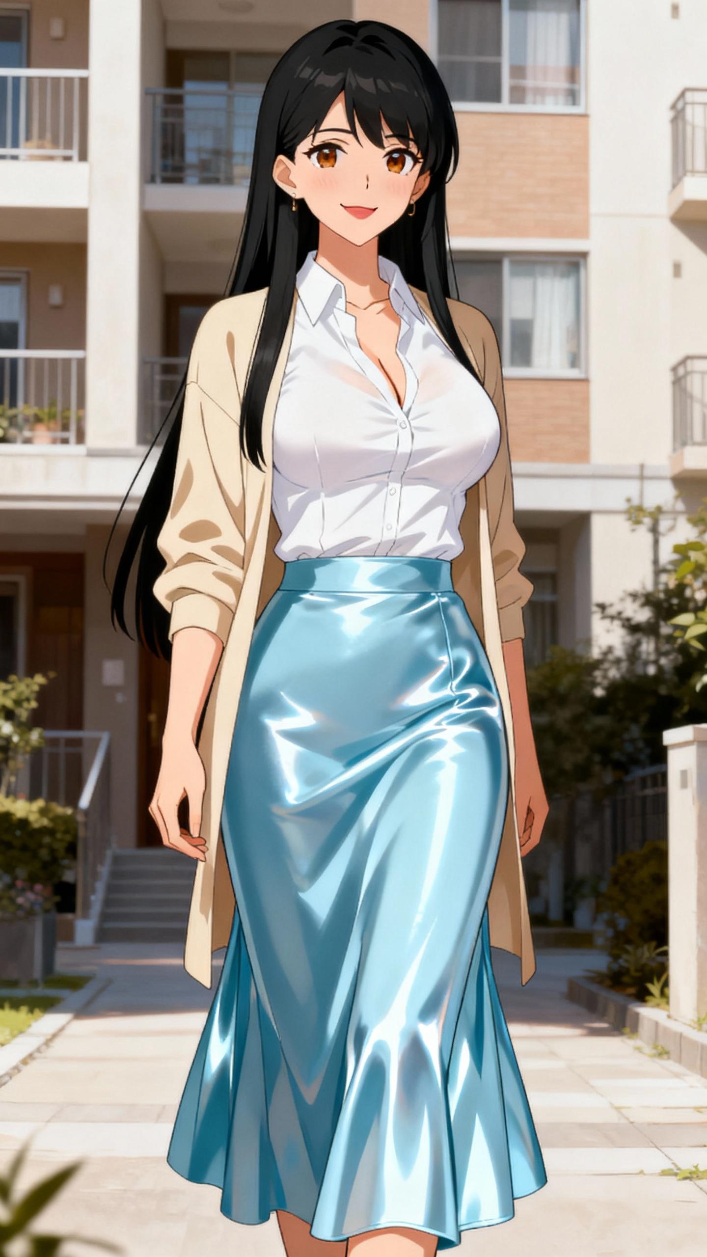 私も早速使用してみました。まずはユリママです。マンション・団地の美人ママをイメージし、普段着はカーディガンにロングスカートとシンプルなスタイルです。艶々系が好きなので、スカートはサテンになるように指示してます。