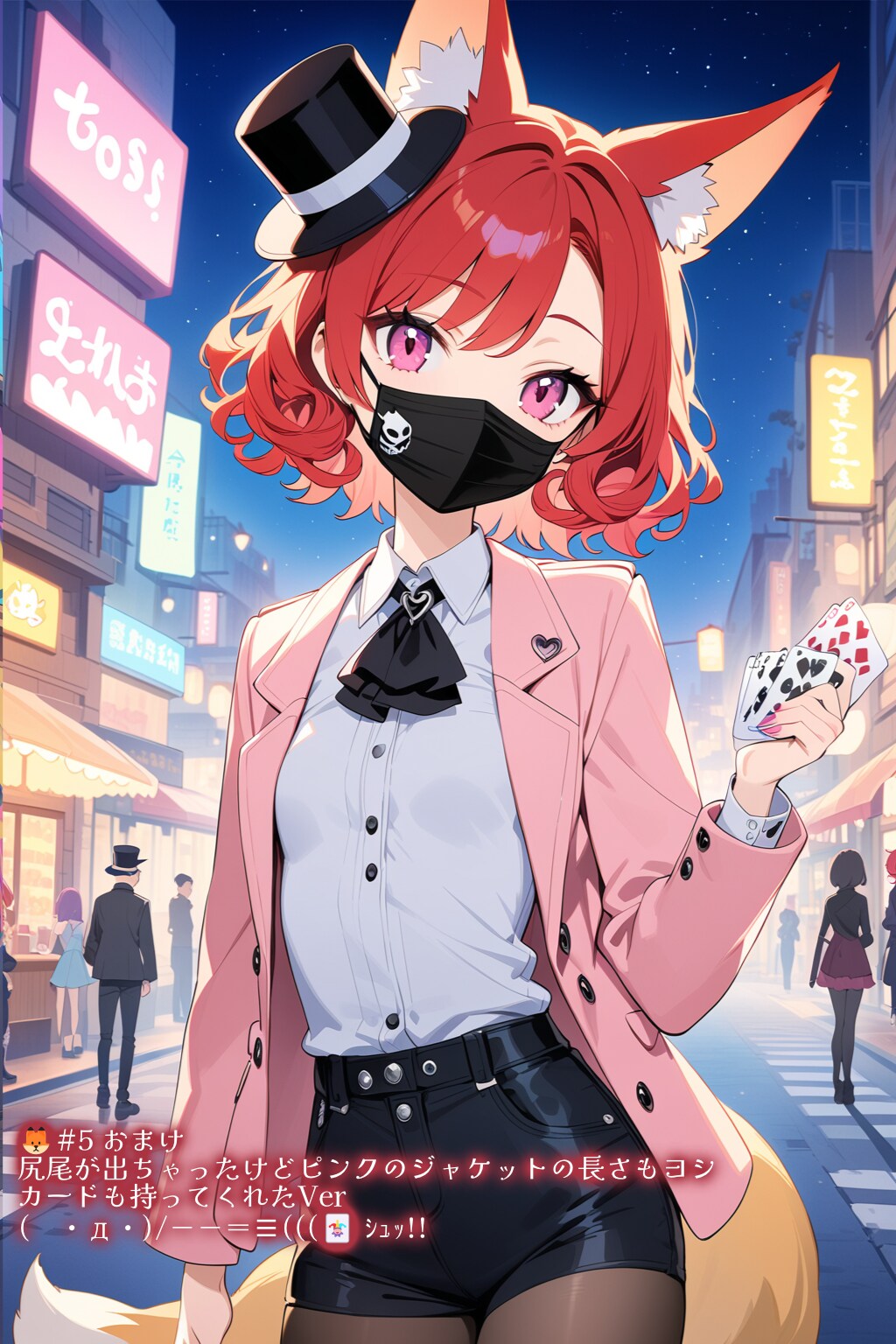 ・拙作の現代設定の作品世界内ではコロナ禍は発生していない想定ですが、今回はサンプル通り mouth mask を色なしで指定しています。おまけに付けたのですが、表情の指定があると口が出ちゃうことが多いですね。