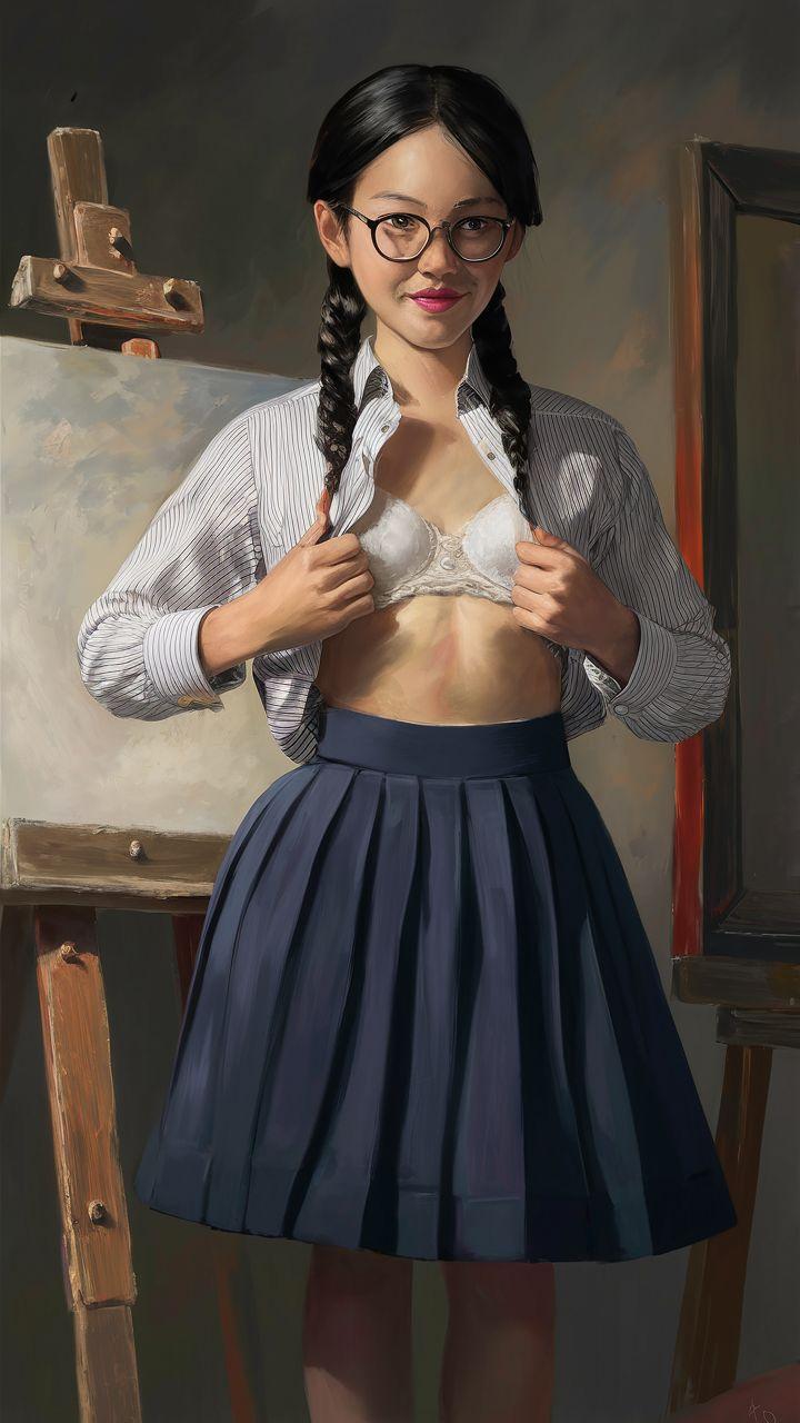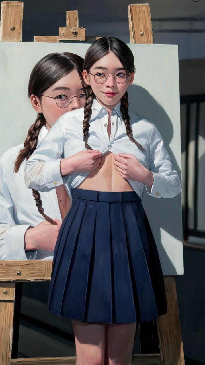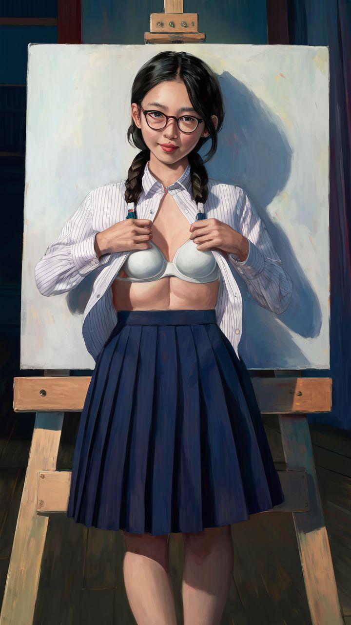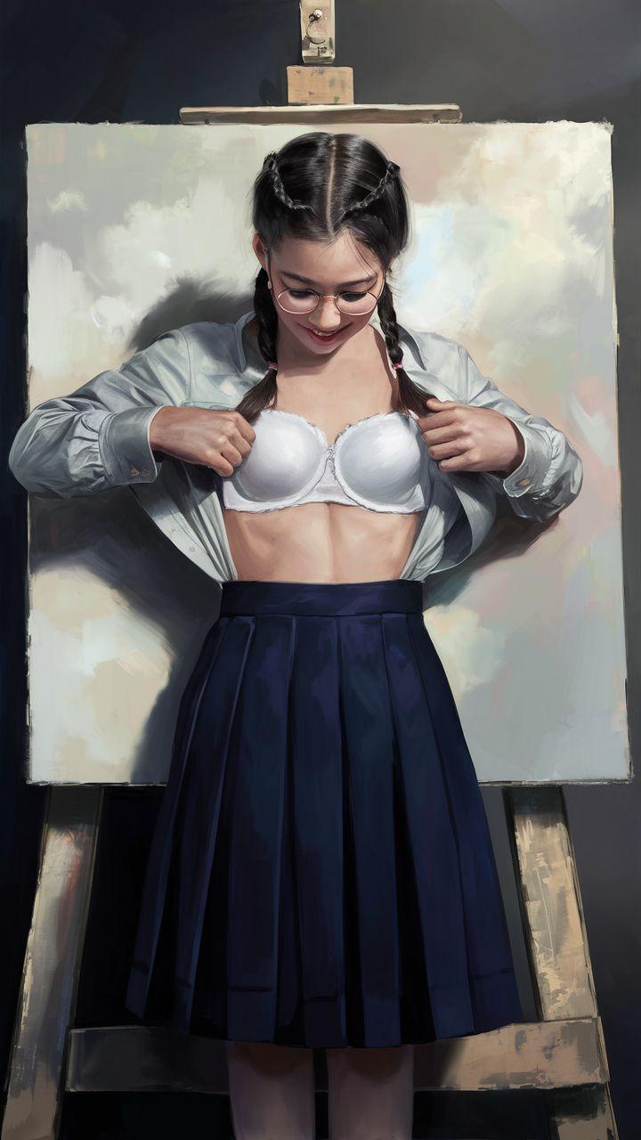 オリジナルは「detailed oil painting, a Japanese teen actress stands in front of a canvas and unbuttoning her shirt from the top, glasses, braids, navy blue knee-length pleated skirt, revealing her white bra, with a shy smiling」