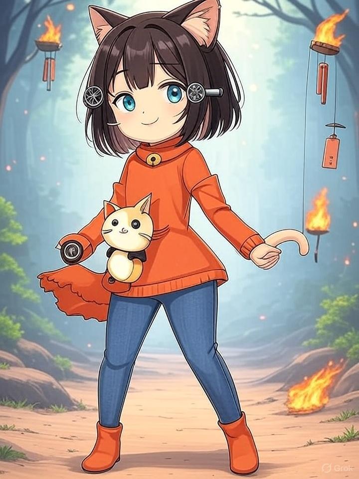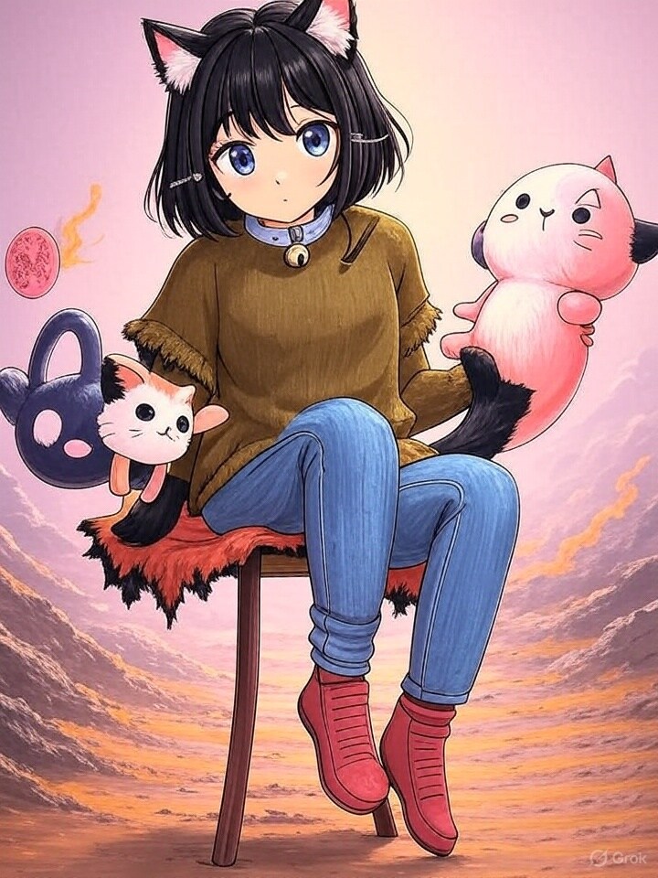 猫耳、黒髪ショートヘア、青い目、鈴がついている猫用の首輪、ぬいぐるみを抱いている、カジュアルな秋物の服装のかわいい女の子のイラストを描いてもらった