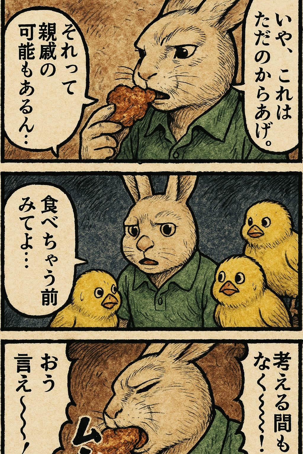 最初のコマの「考える間もなく〜〜〜〜!」で唐揚げにむしゃぶりつく勢いはすき