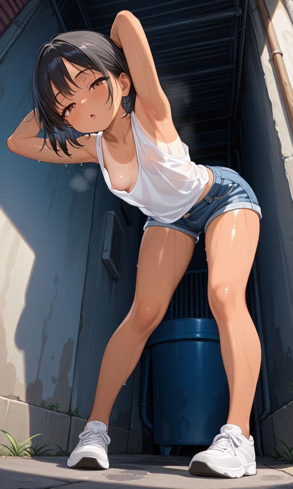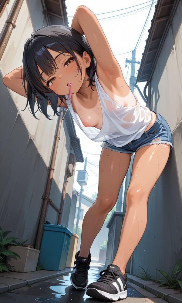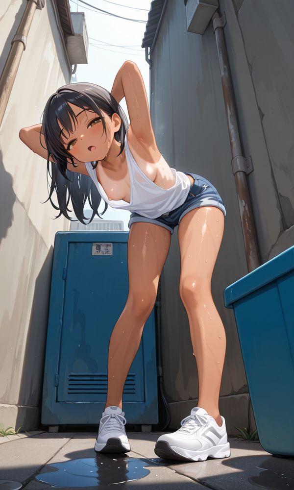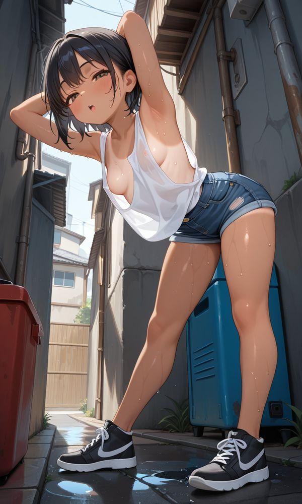 ホームベースのの路地裏で、大胆なポーズをしてくれる半目ちゃん