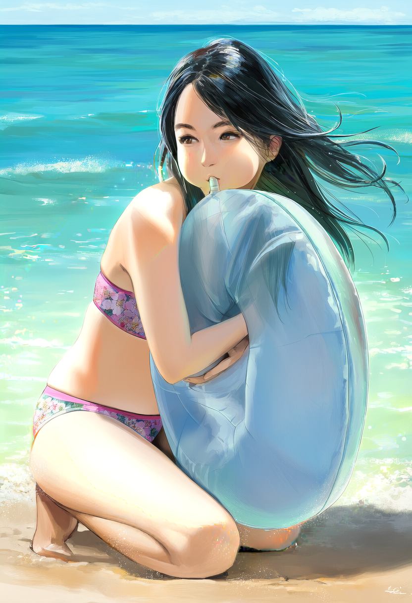 花柄のビキニと砂浜を浮き輪に合わせてみました。
