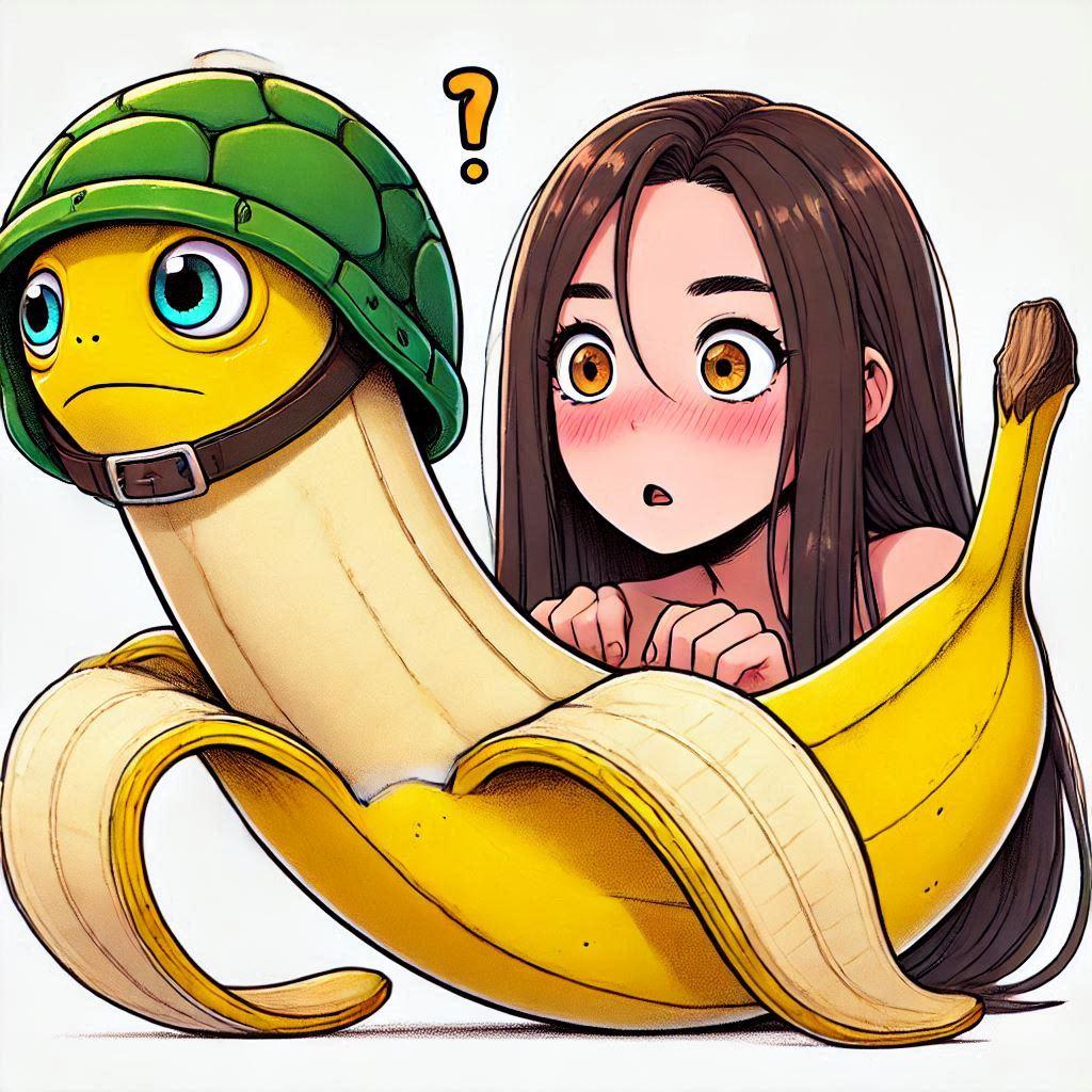 バナナの黄色い体に、小さな亀の頭を付け、頭の上にはヘルメットをかぶせます。